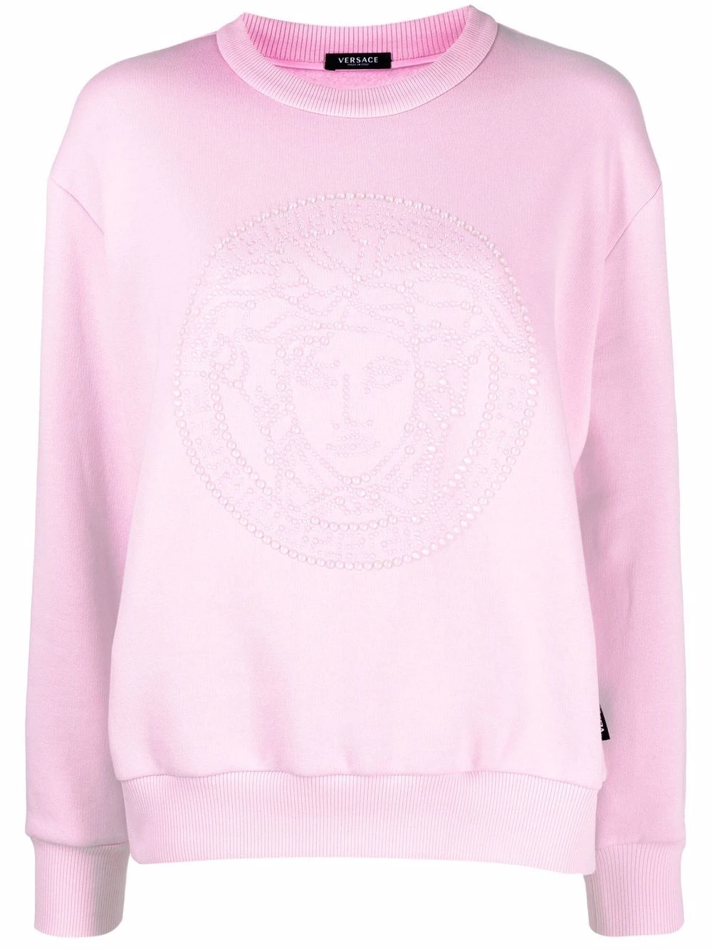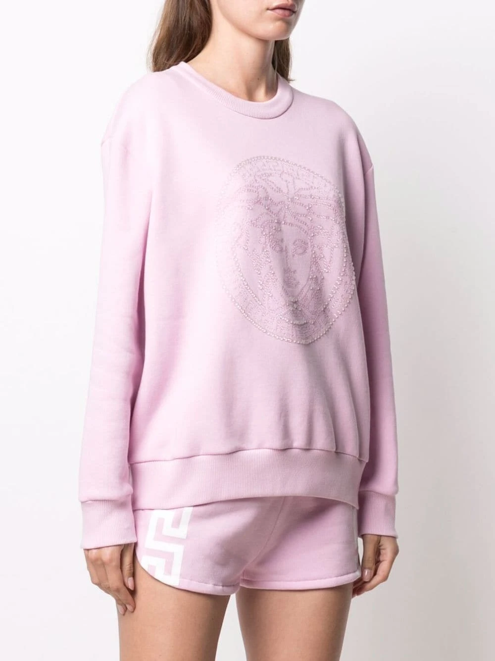 Motif Medusa, ornement en cristal, encolure ras du cou, manches longues, ourlet droit, bordures nervurées. Couleur : rose. Matière : coton.