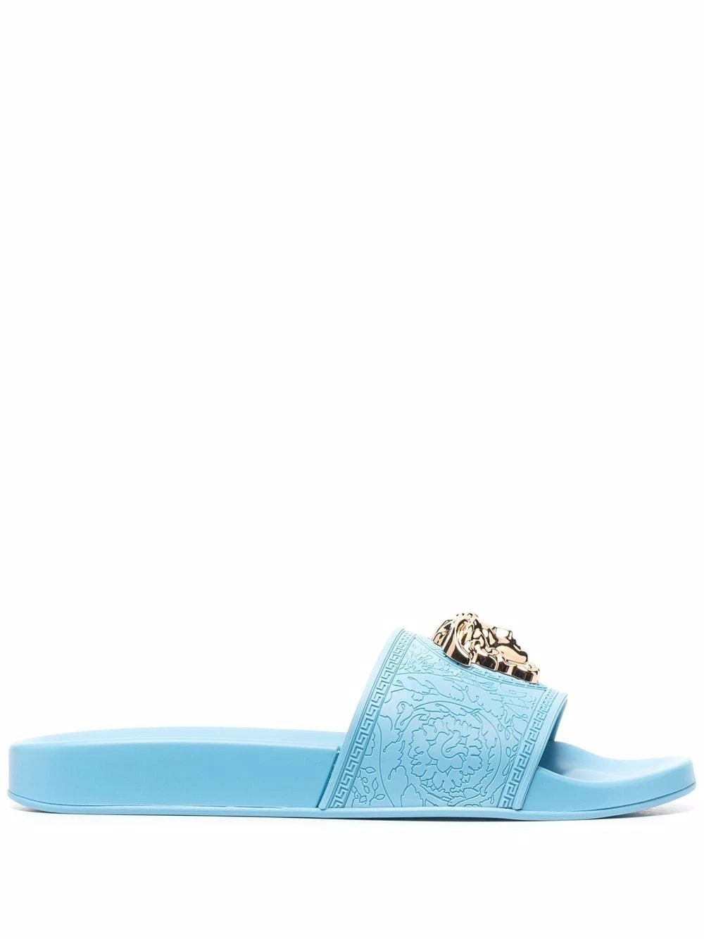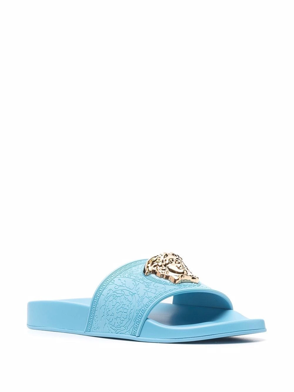 Bout ouvert, semelle intérieure à logo, design à enfiler, semelle plate en caoutchouc, motif Medusa. Couleur : bleu.