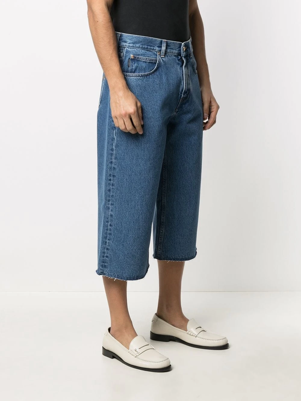 Coupe ample, fermeture boutonnée, fermeture zippée, passants de ceinture, 5 poches classiques, bords francs. Couleur : bleu. Matière : coton.