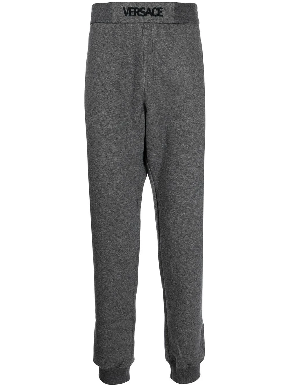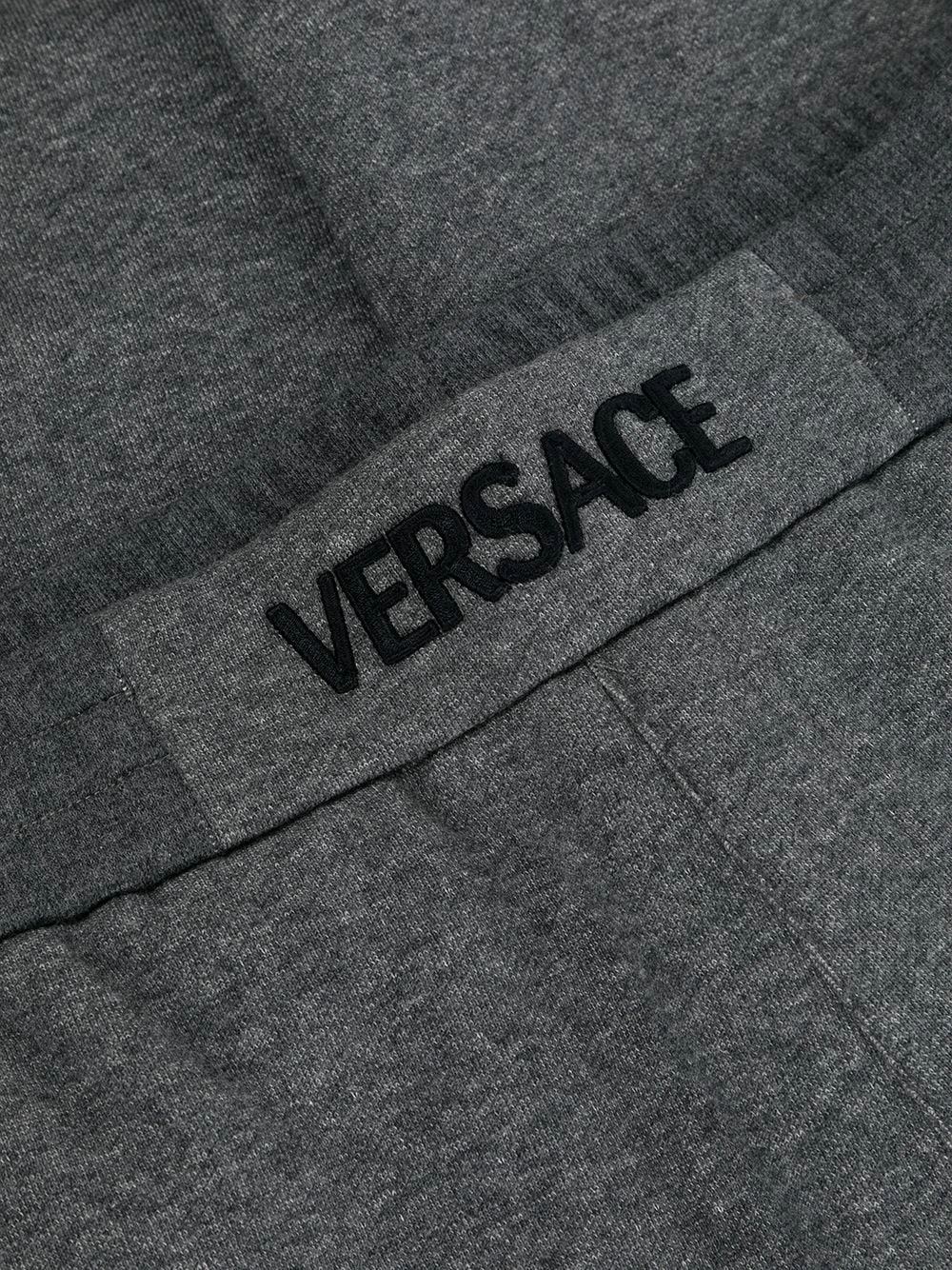 Ceinture à logo, tricot point jersey, coutures ton sur ton, poches plaquées latérales, poche arrière passepoilée, imprimé La Greca signature, poignets élastiqués. Couleur : gris. Matière : coton.
