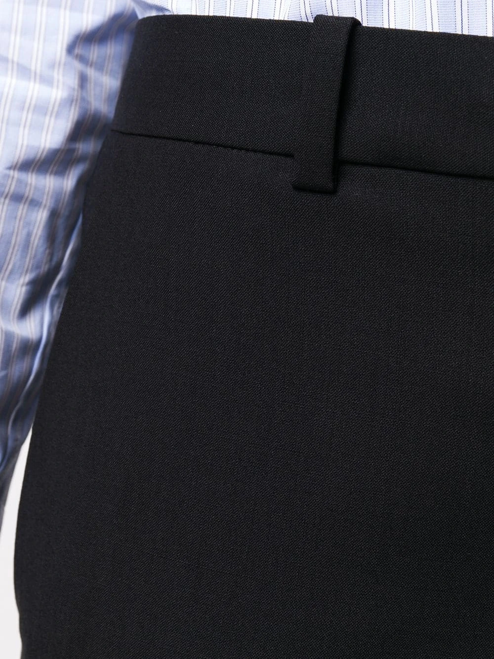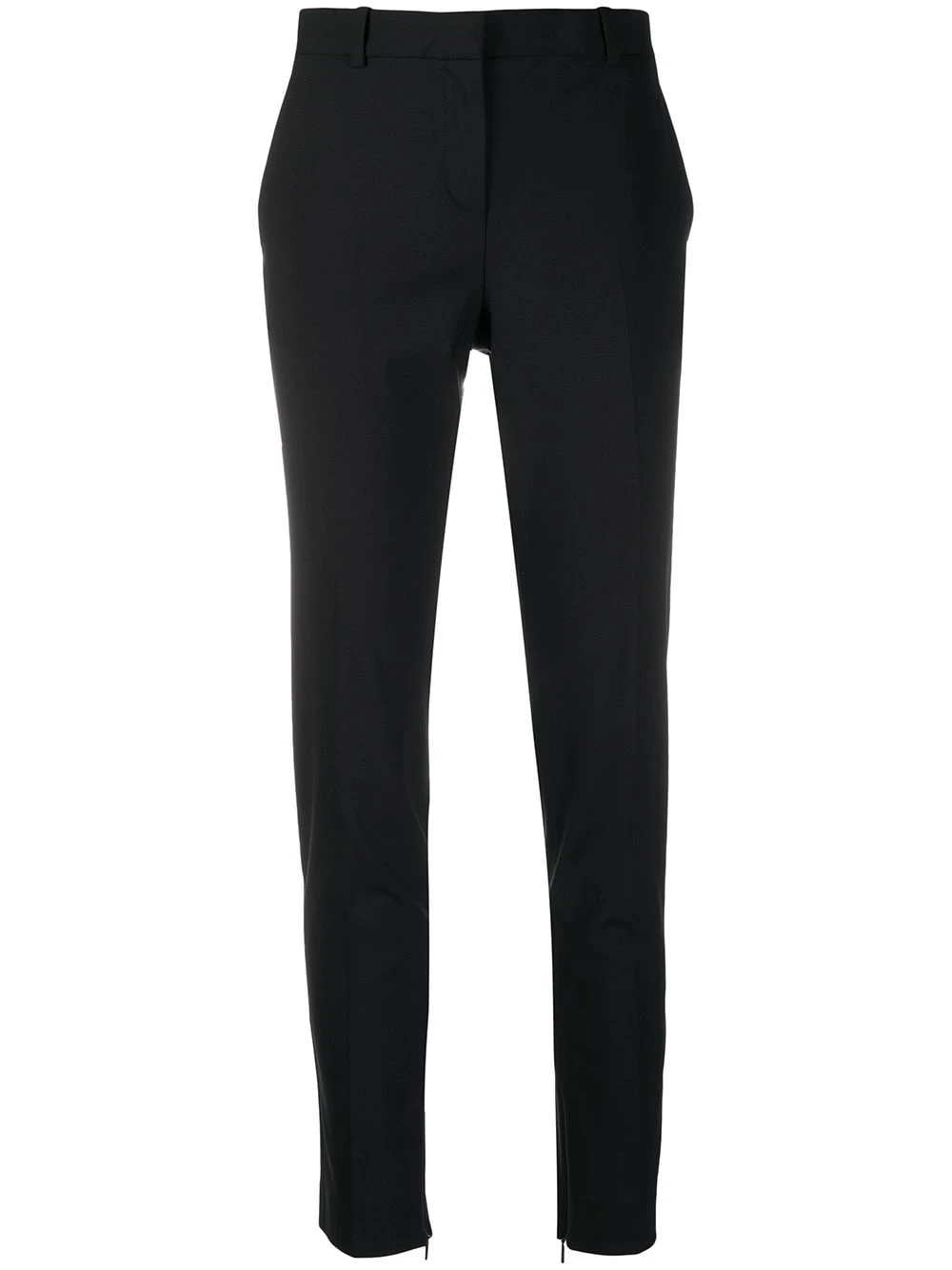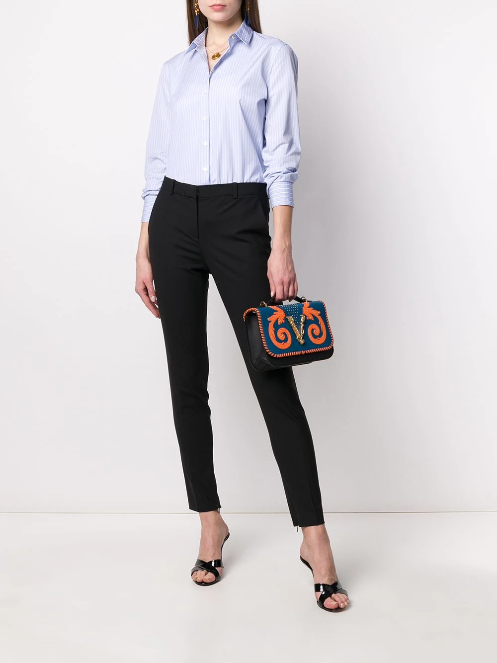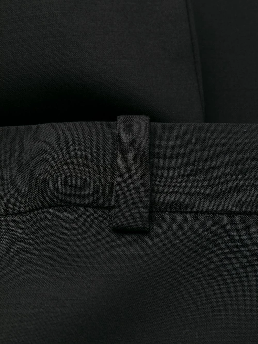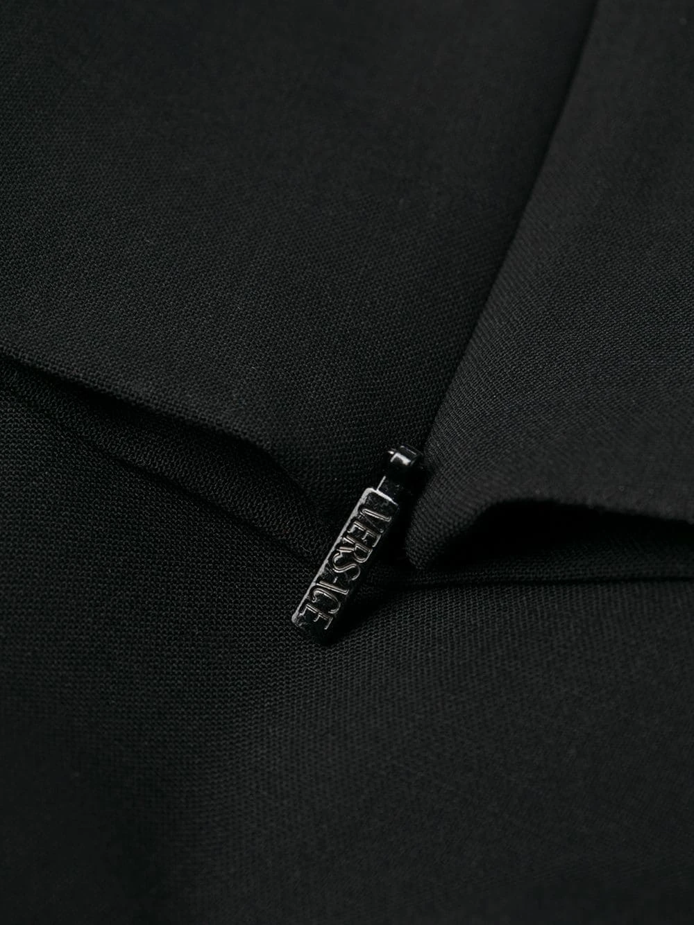 Pantalon de costume skinny Versace avec coupe skinny, taille haute, passants de ceinture, fermeture devant dissimulée, poches latérales fendues et zips aux chevilles. Couleur : noir.