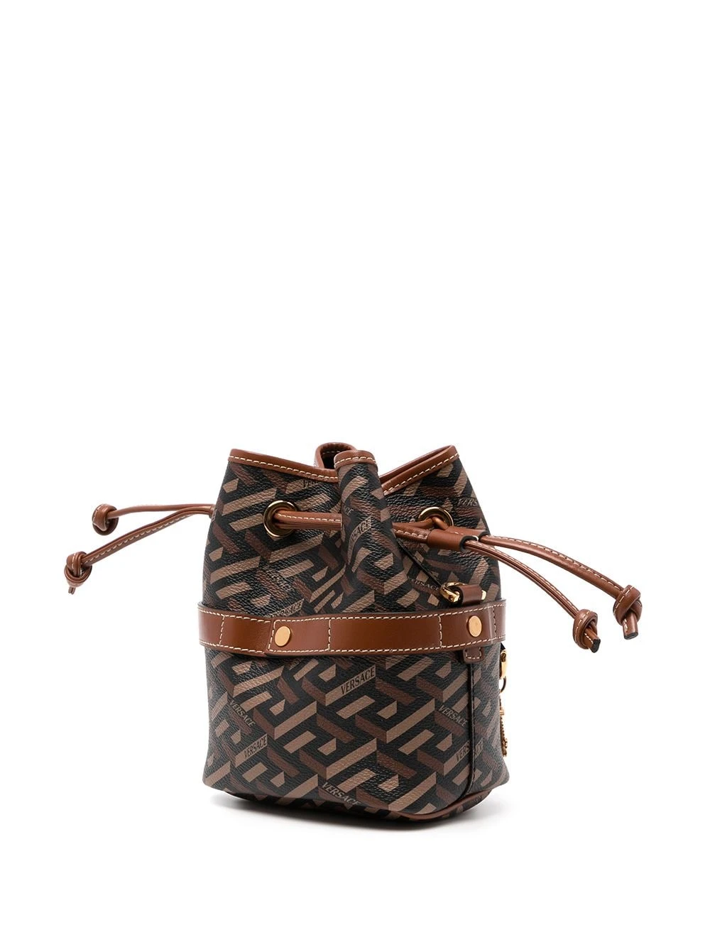 Imprimé La Greca signature, logo imprimé sur le devant, finitions en métal doré, fermeture à lien de resserrage, bride porté épaule ajustable. Matière : cuir.