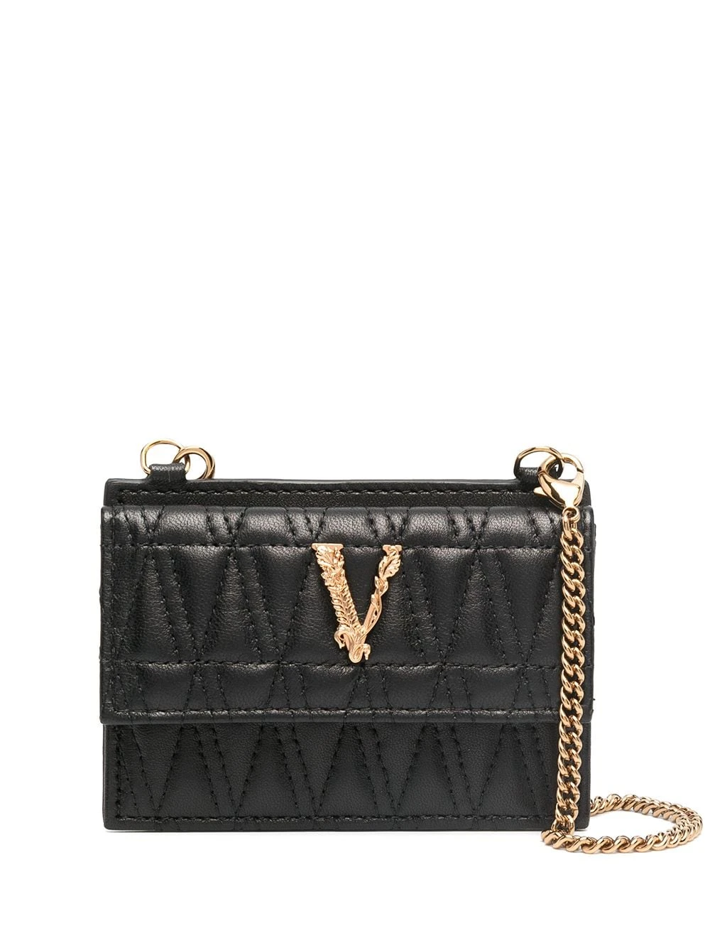 Effet matelassé, plaque logo, logo embossé sur le devant, finitions en métal doré, fermeture à boutons pression, fentes pour carte, bride porté épaule en chaîne détachable. Couleur : noir. Matière : cuir.