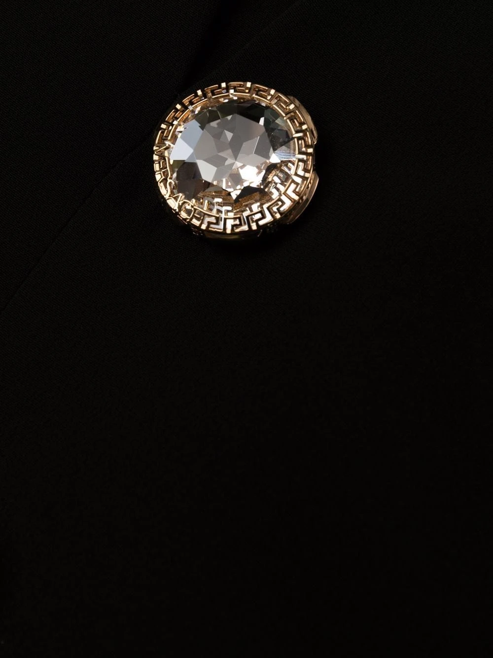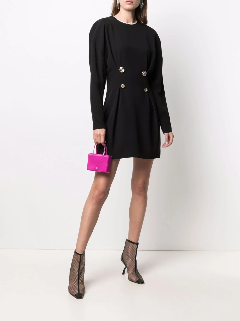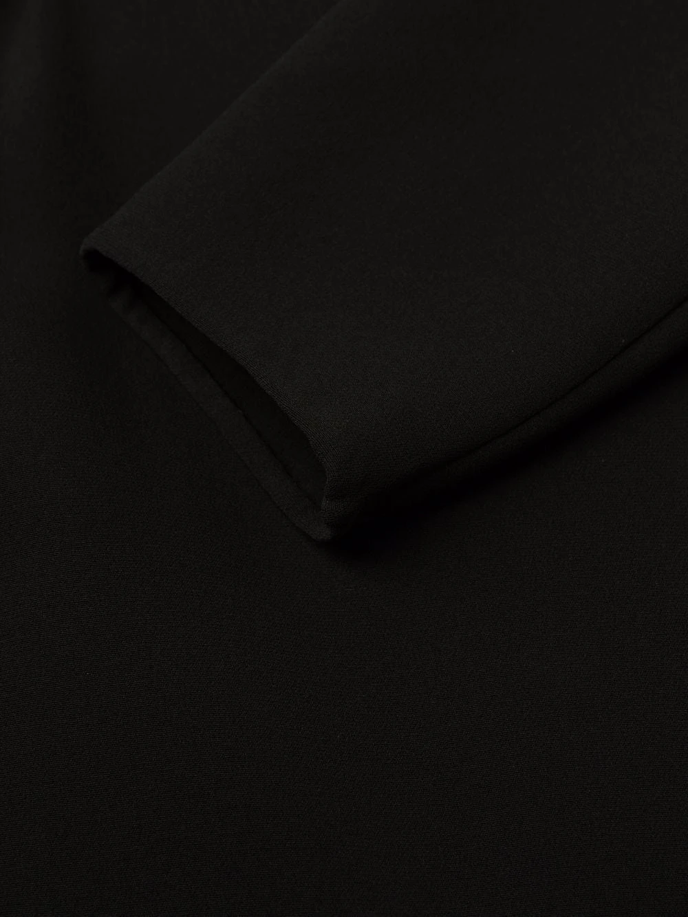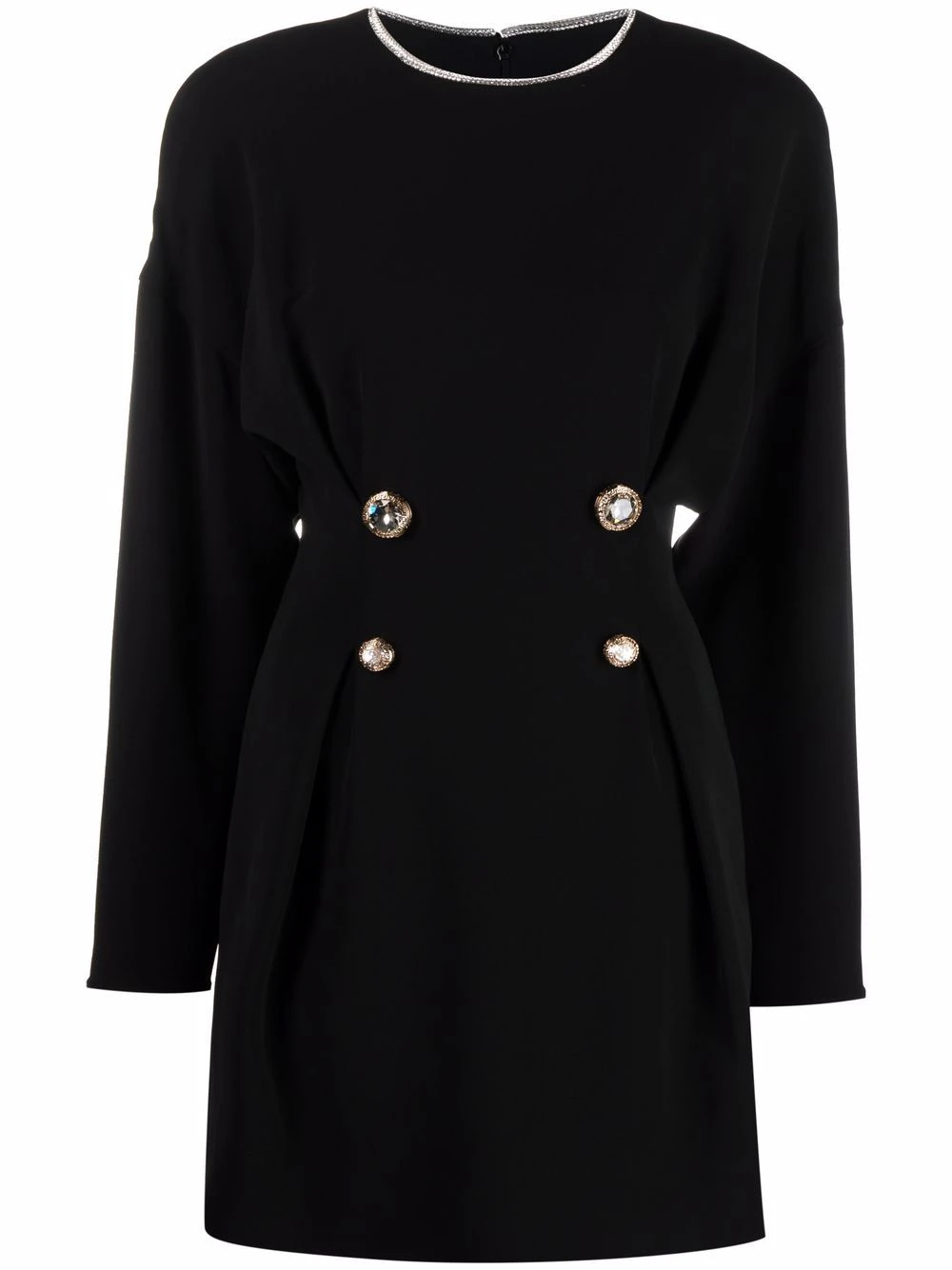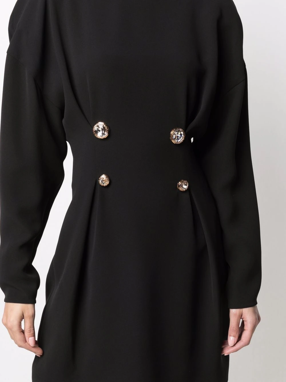 Boutons ornés de cristaux, ornement en cristal, encolure ronde, manches bouffantes longues, taille ajustée, fermeture zippée dissimulée à l’arrière. Couleur : noir. Matière : soie.