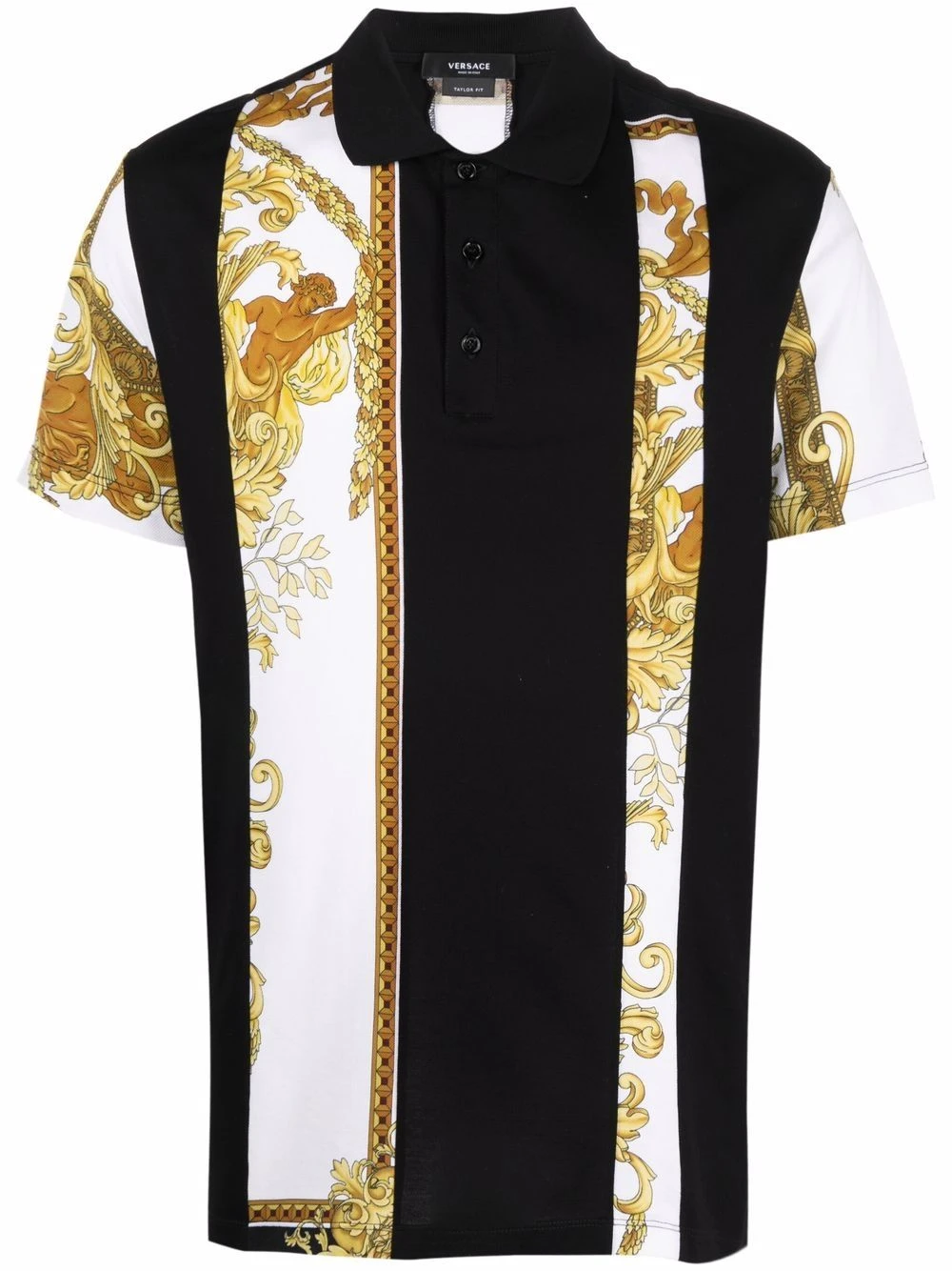 Empiècements contrastants, motif baroque, col polo, boutonnière sur le devant, manches courtes. Matière : coton.