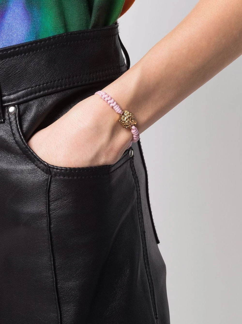 Détail Medusa, finitions en métal doré, lanière tressée.