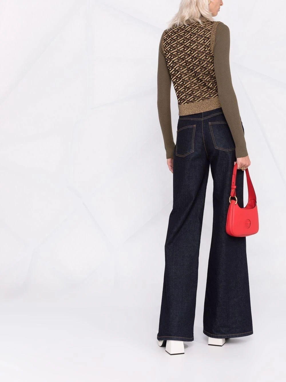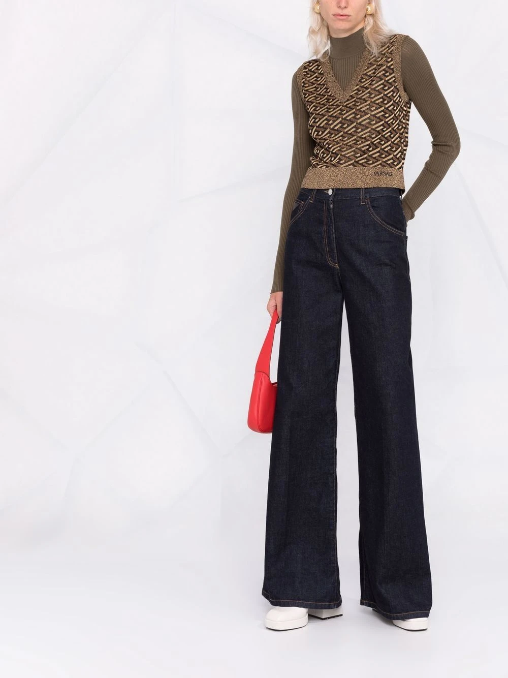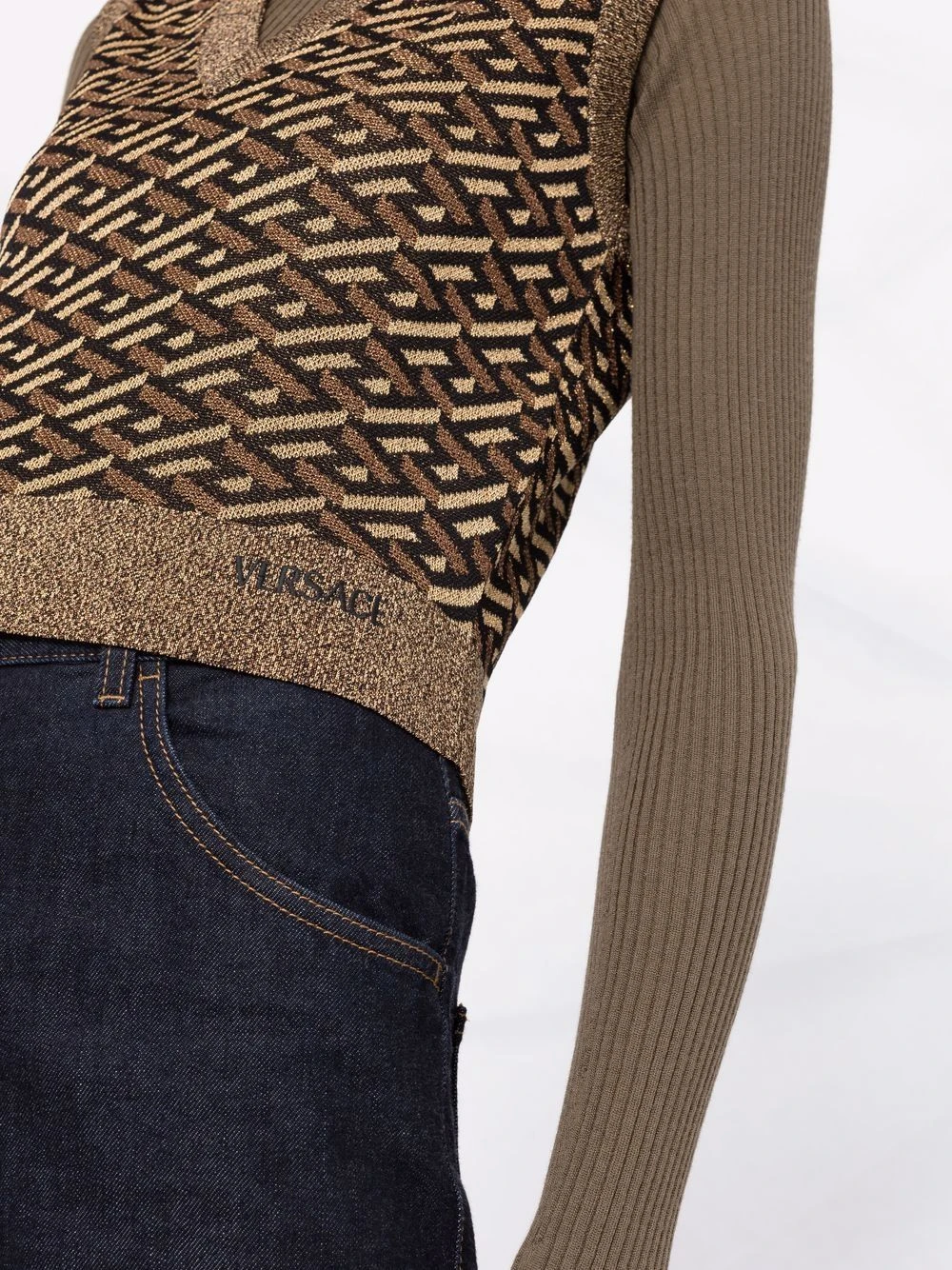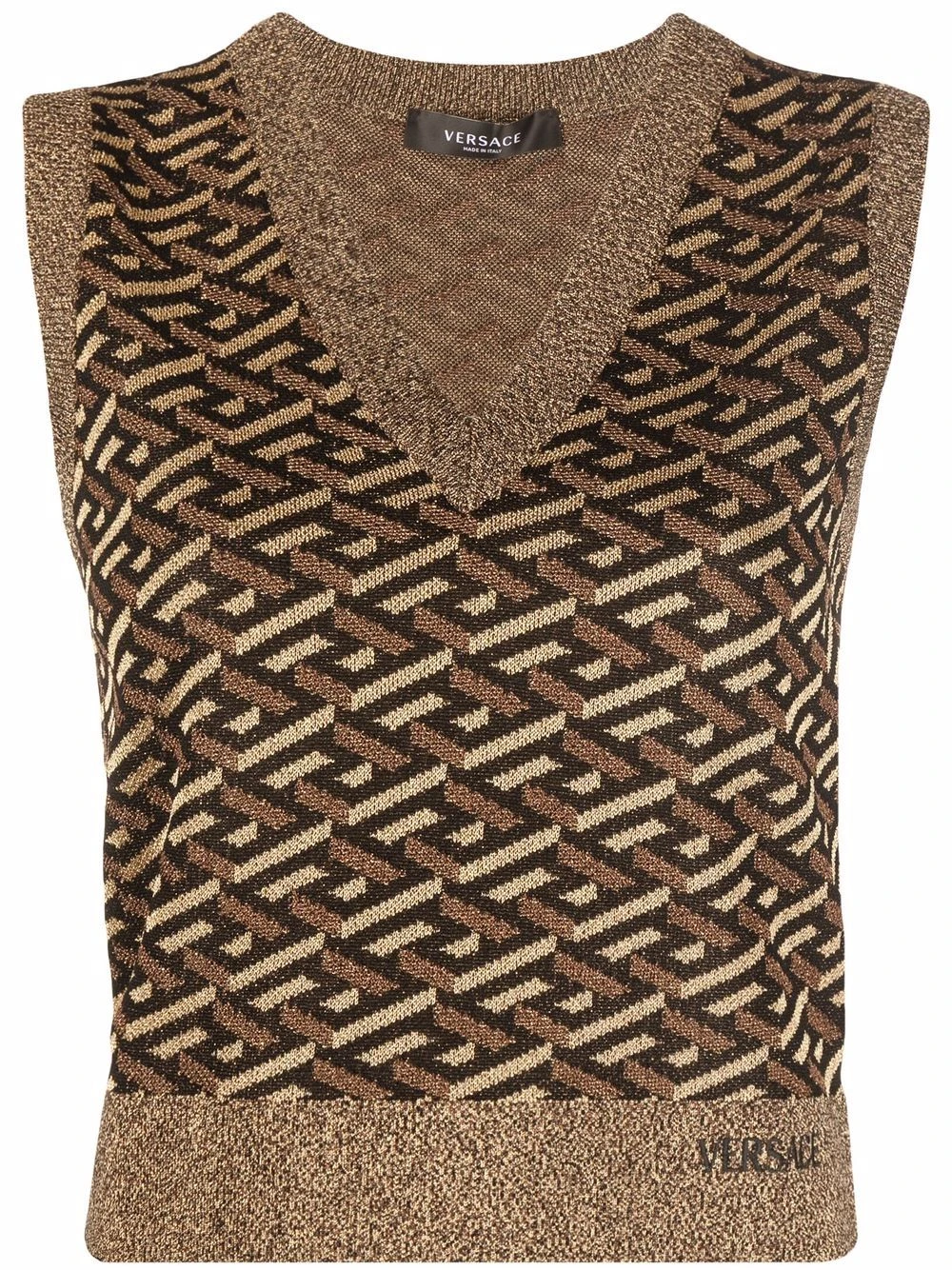 Imprimé La Greca signature, col v, design sans manches, ourlet droit.