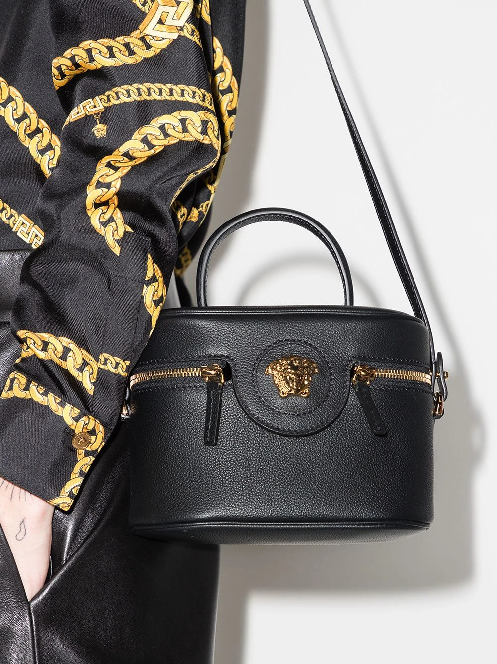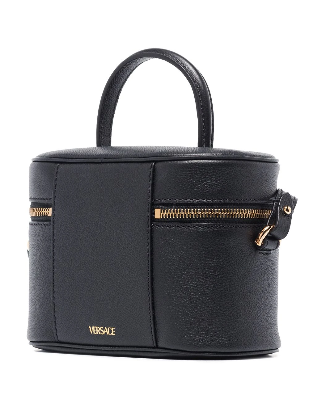 Motif Medusa, finitions en métal doré, bride porté épaule détachable et ajustable, anse arrondie, fermeture zippée tout autour, logo doré, patch logo intérieur. Couleur : noir. Matière : cuir.