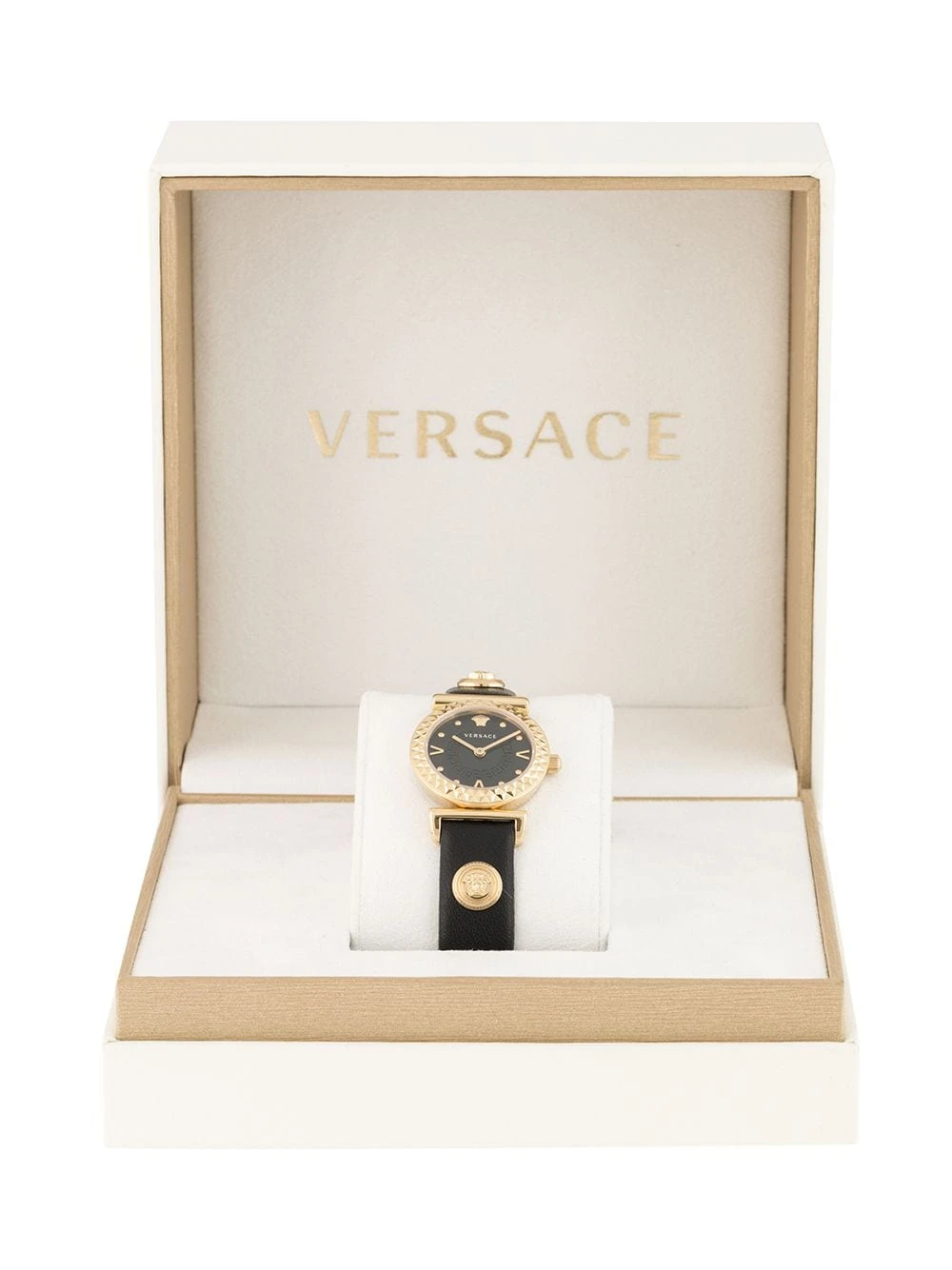 BoĂźtier en acier inoxydable, mouvement Ă quartz, boĂźtier rond, motif Medusa, taille ajustable. MatiĂšre : cuir.