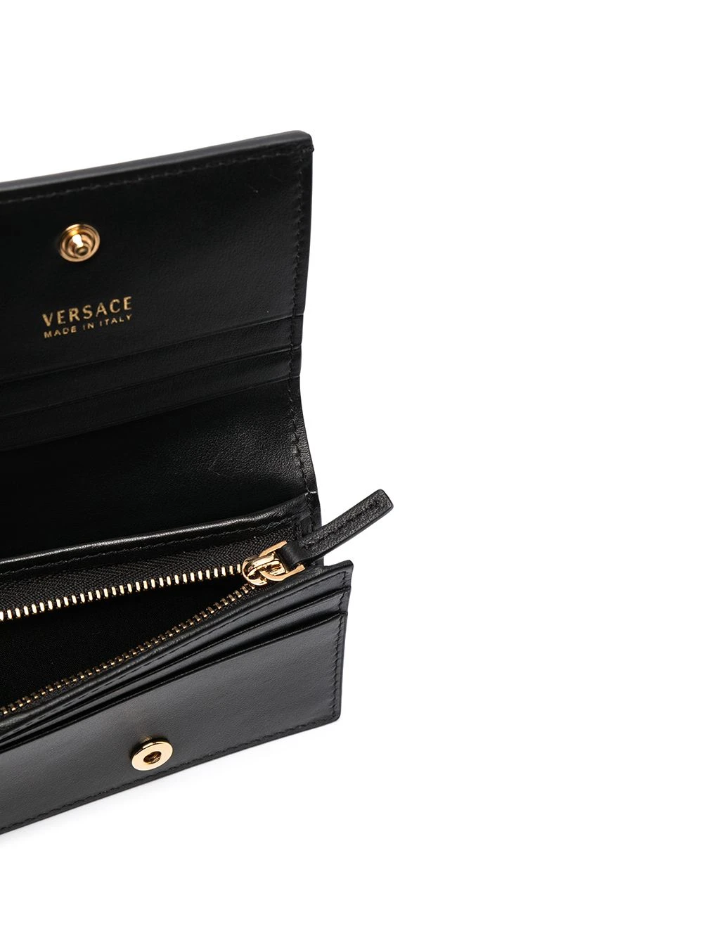 Plaque logo dorée, logo embossé, fermeture à boutons pression, poche ticket, compartiments intérieurs pour carte. Couleur : noir. Matière : cuir.