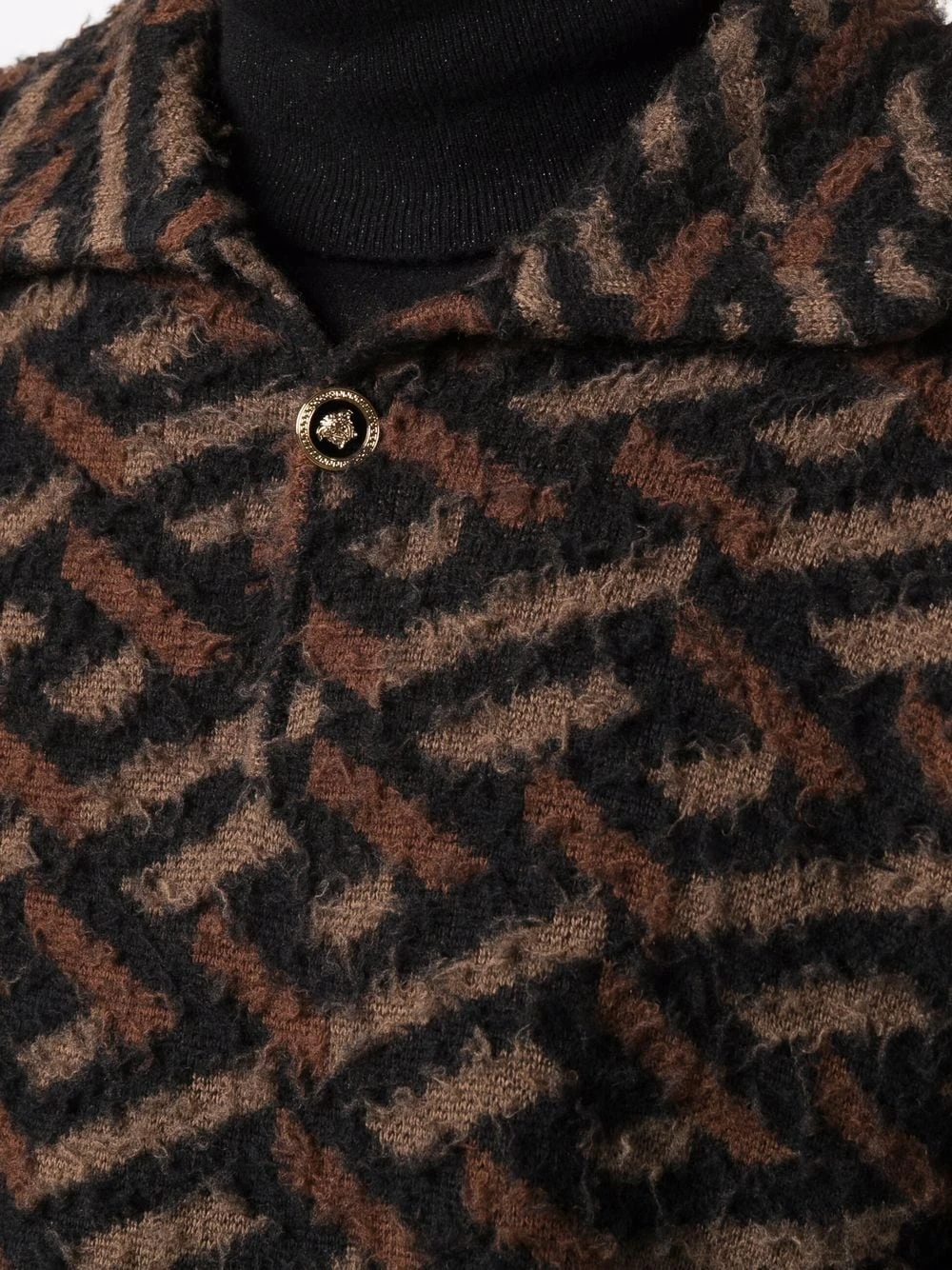 Col classique, boutonnière sur le devant, manches longues, imprimé La Greca signature, design en maille. Matière : laine vierge.