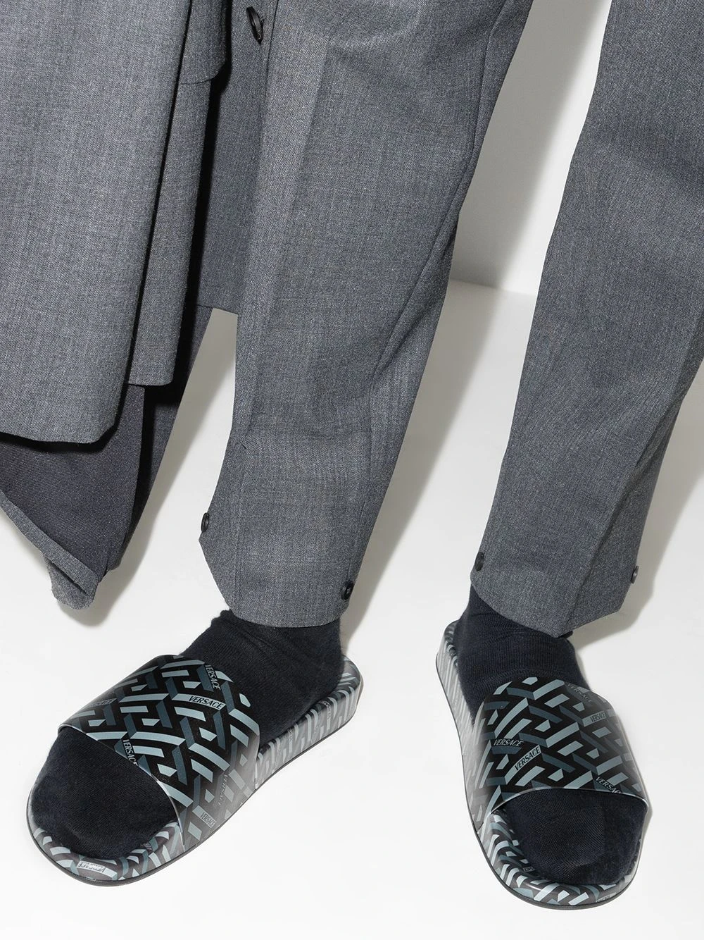 Motif Greca signature imprimé, bout ouvert, design à enfiler, semelle plate.