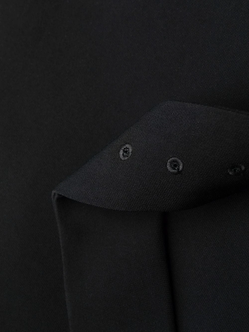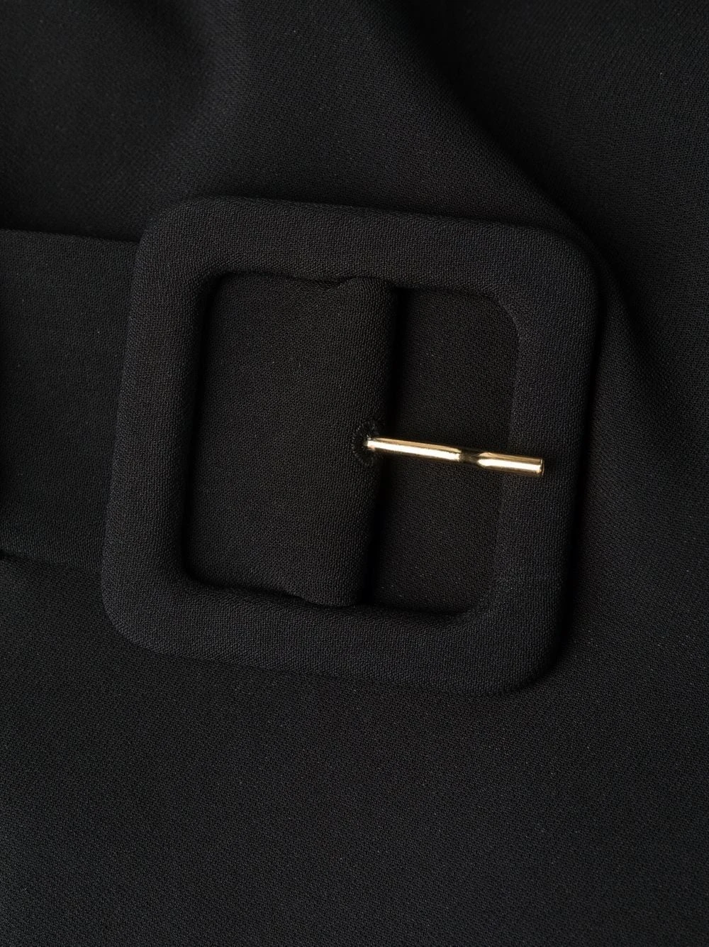 Design évasé, encolure ronde à détail de fente, fermeture zippée dissimulée à l’arrière, design sans manches, taille ceinturée, plis creux, hauteur genou. Couleur : noir.