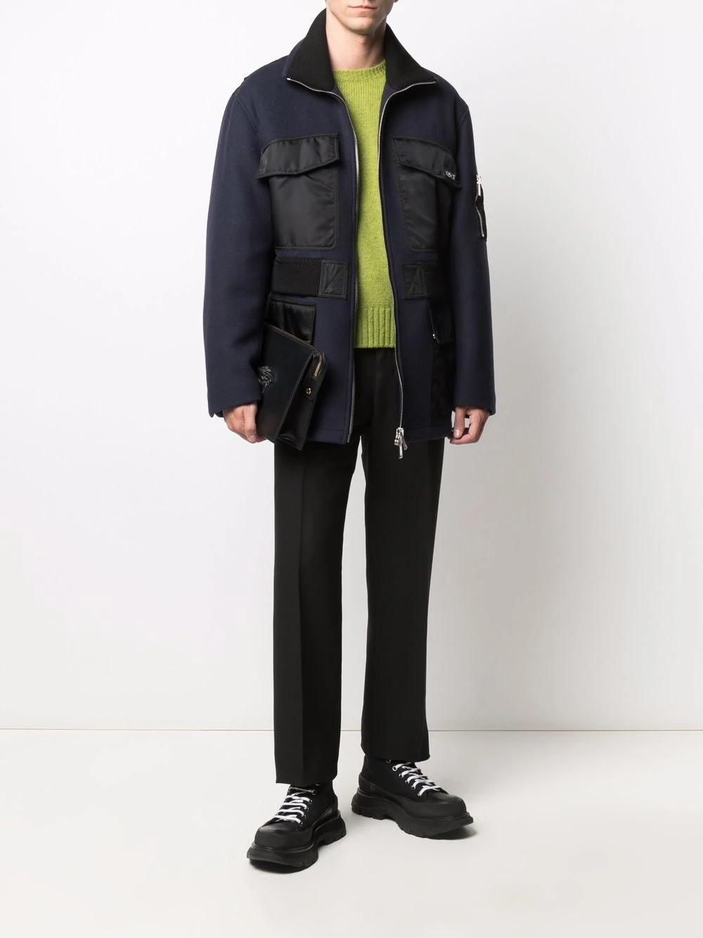 Poches devant à rabat, design à empiècements, fermeture zippée devant, manches longues, ourlet droit.