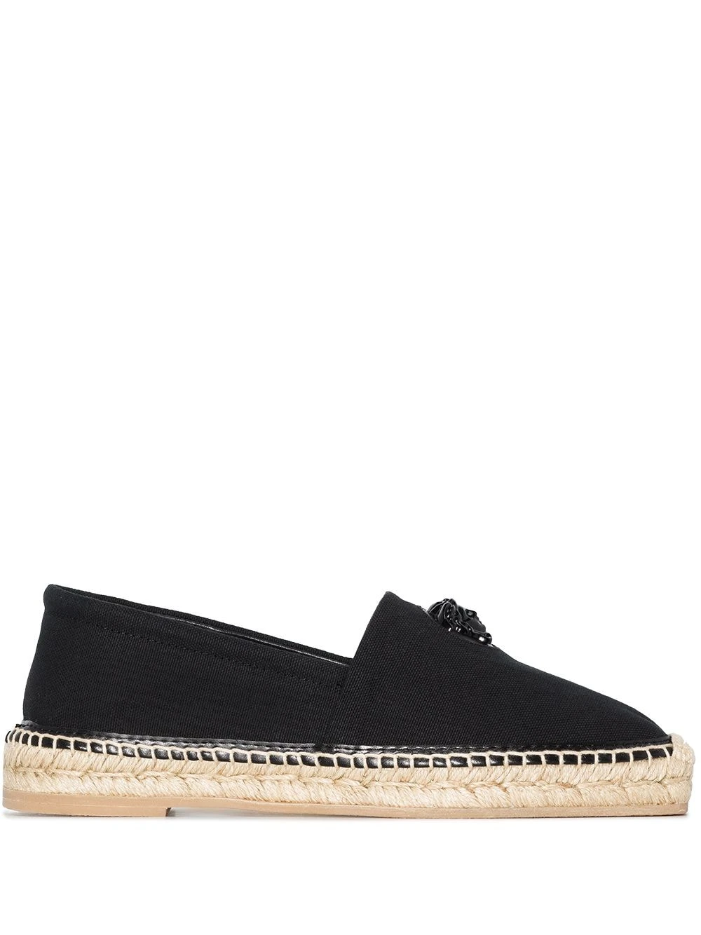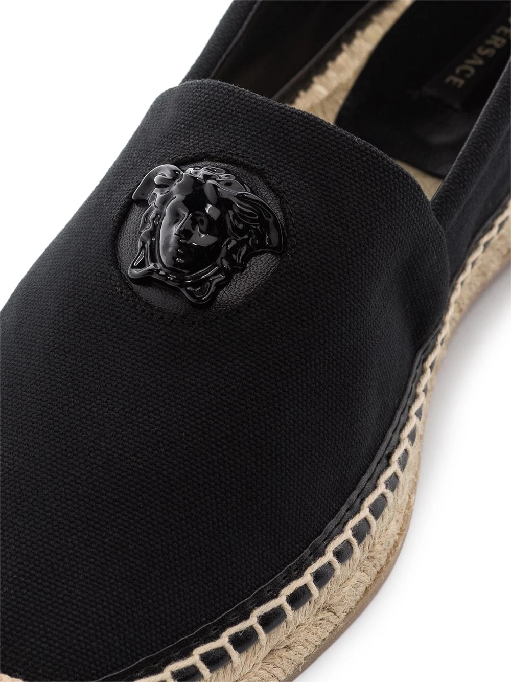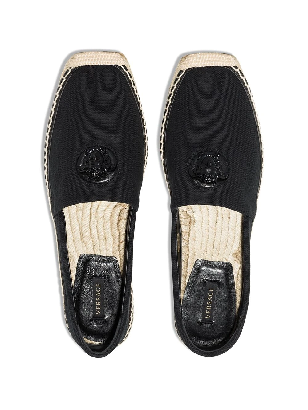 Détail Medusa, semelle en raphia tressé, bout carré, design à enfiler, semelle intérieure à logo. Couleur : noir.