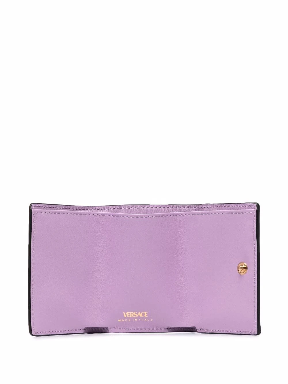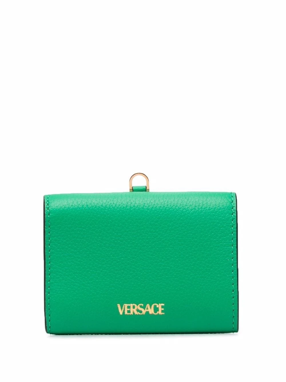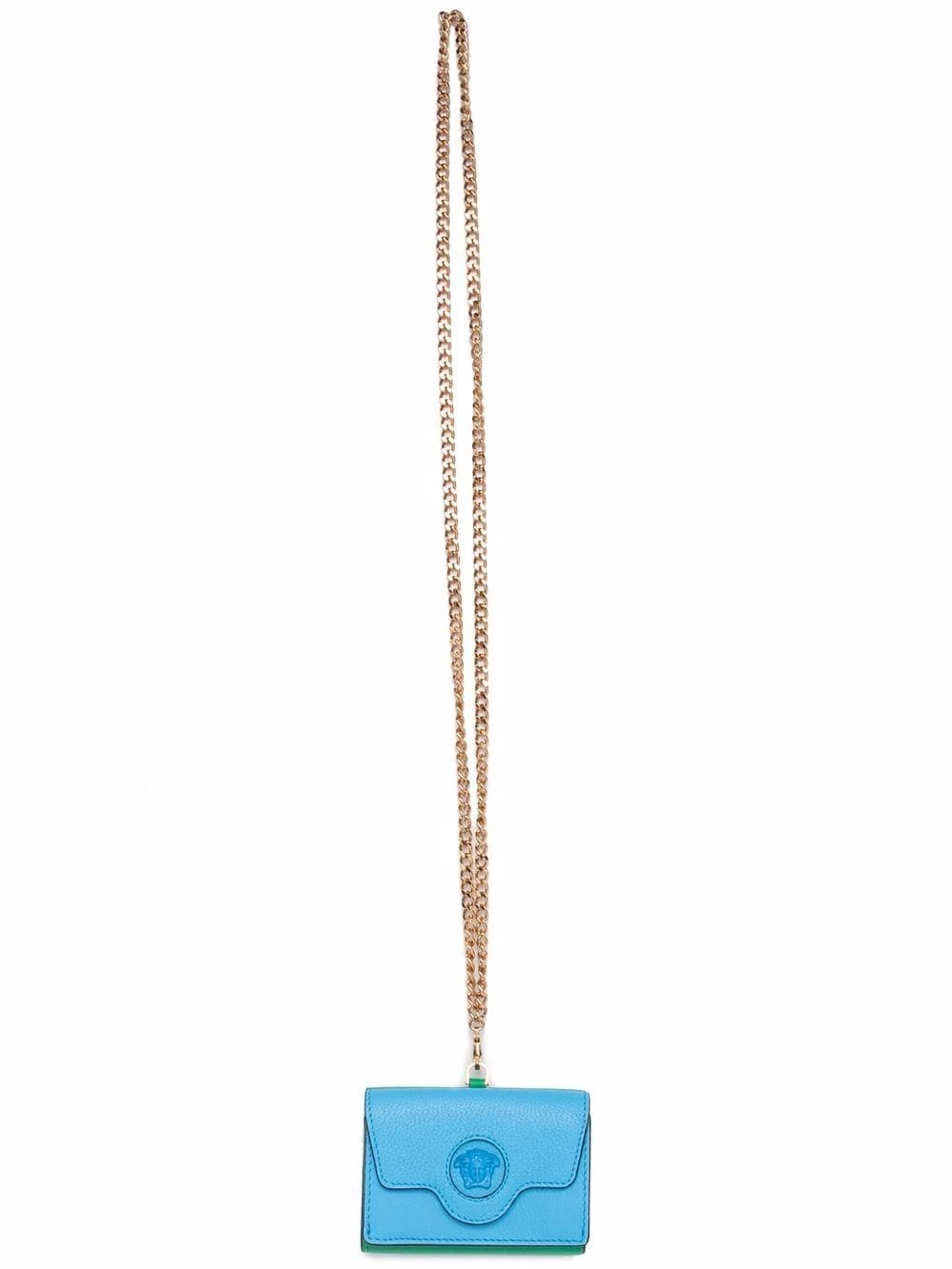 Motif Medusa, logo doré, lanière autour du cou à maillons, finitions en métal doré, design pliable, compartiment à billets intérieur. Matière : cuir.
