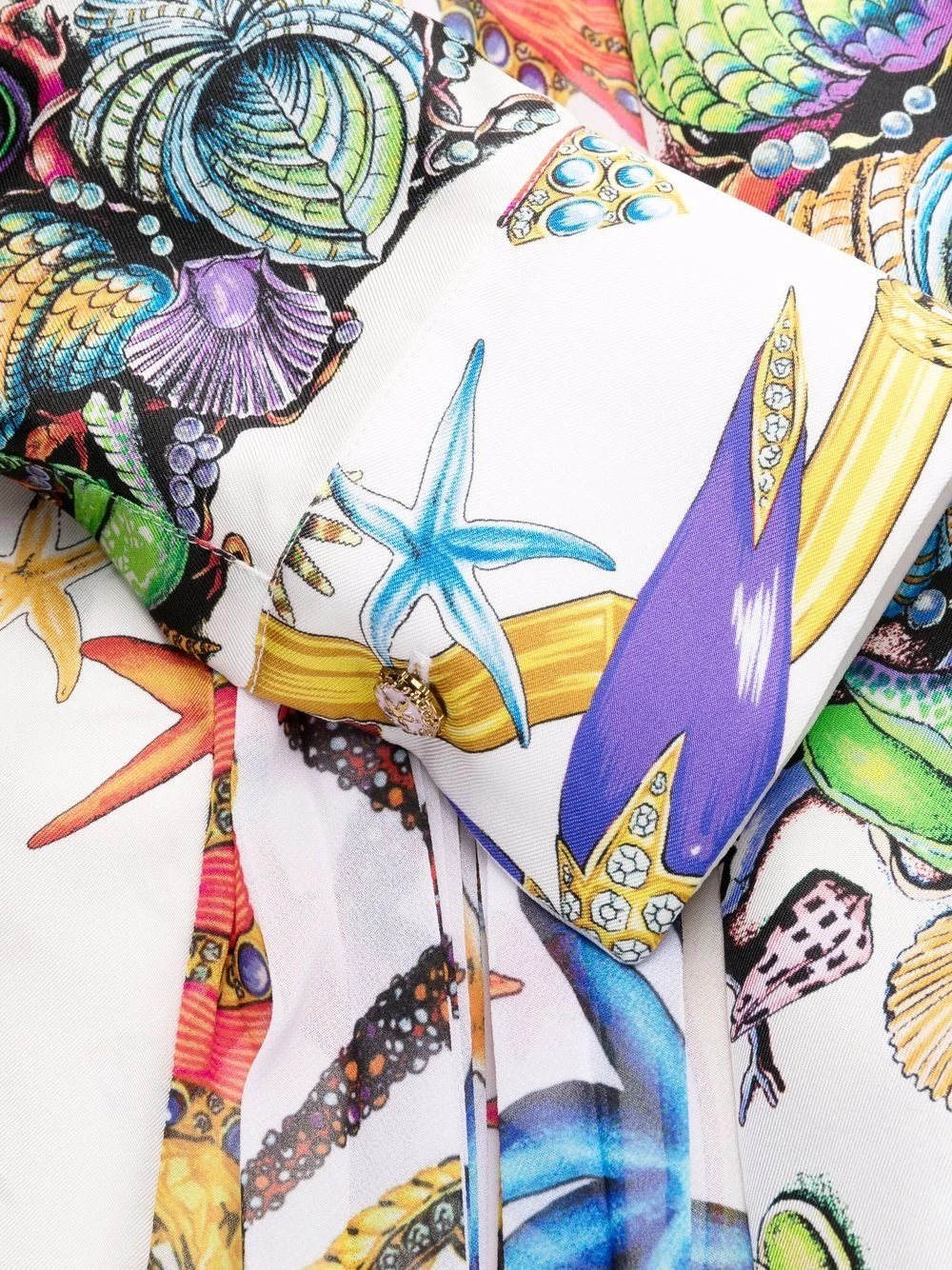 Coquillage imprimé, col classique, boutonnière sur le devant, manches longues, taille ceinturée. Couleur : blanc. Matière : soie.