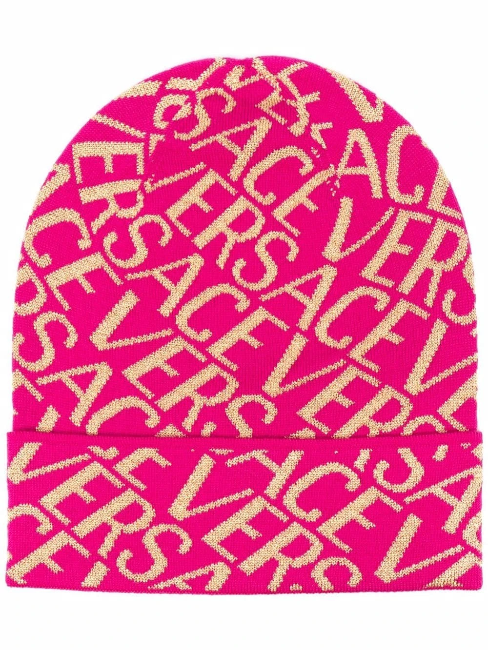 Design tricoté, logo intarsia, tissage métallisé, ourlet retroussé.