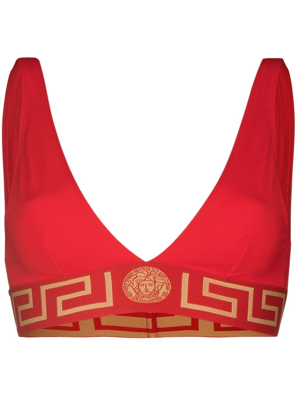 Red Greca triangle bikini top from VERSACE featuring signature Greca detailing, Medusa Head motif and elasticated underband. Be mindful to try on swimwear over your own garments..