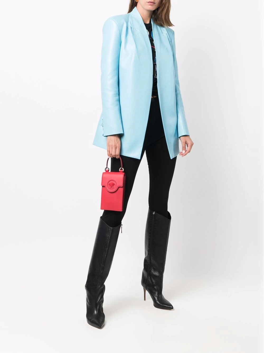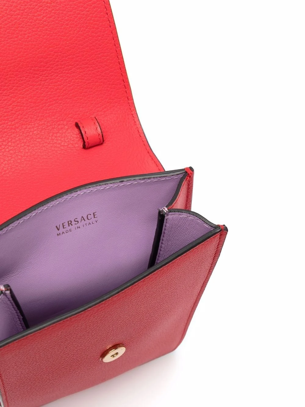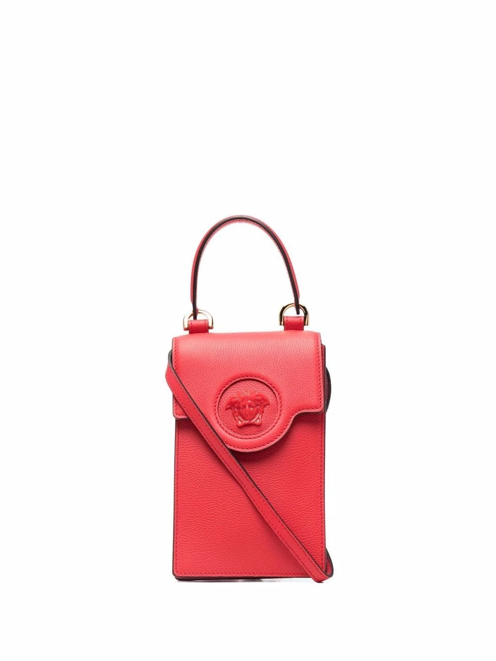 Motif Medusa, anse arrondie, bride porté autour du cou détachable, dessus à rabat avec bouton pression. Couleur : rouge. Matière : cuir.