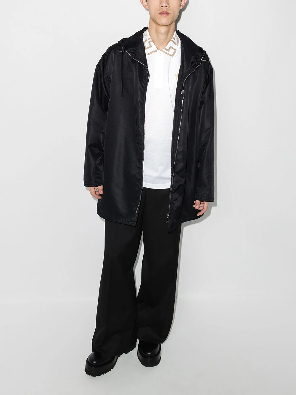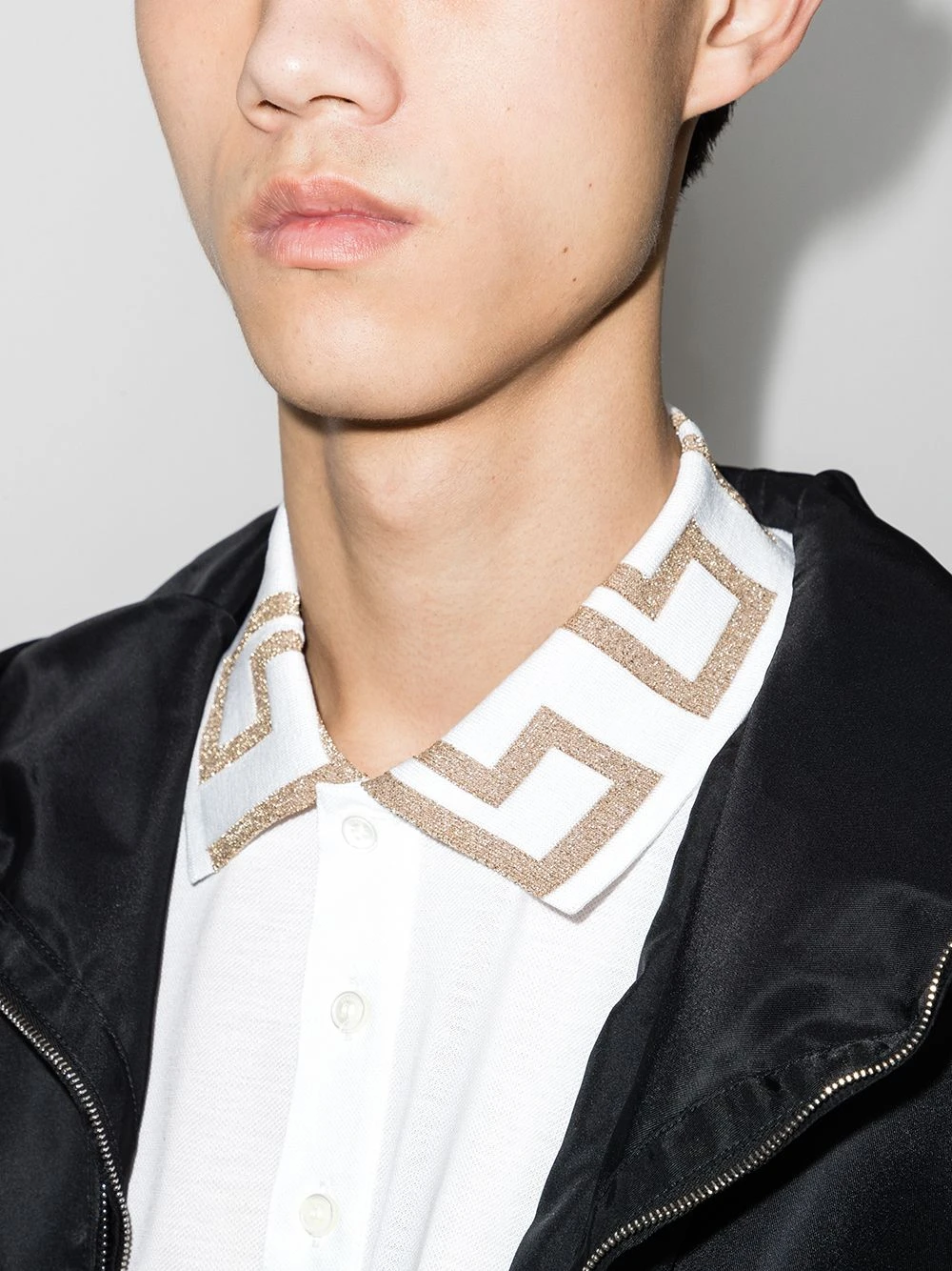 Optical white cotton Greca-collar polo shirt from VERSACE featuring signature Greca detailing, Medusa plaque detail, polo collar, front button placket, short sleeves and straight hem.