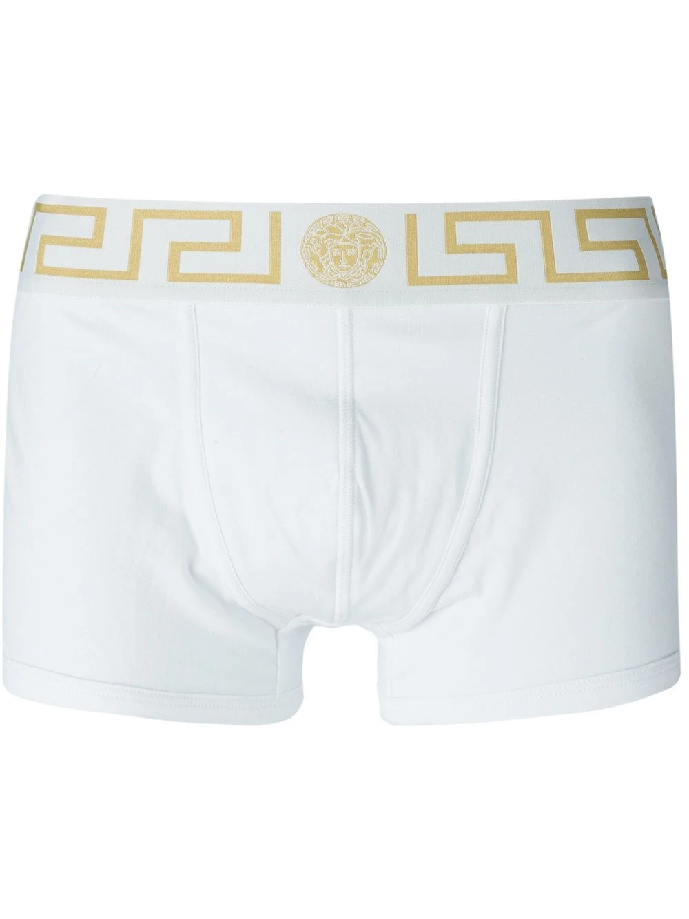 Boxer à taille élastique Greca en coton stretch blanc Versace avec bordure élastique. Les sous-vêtements et la lingerie doivent être essayés par dessus vos propres vêtements.