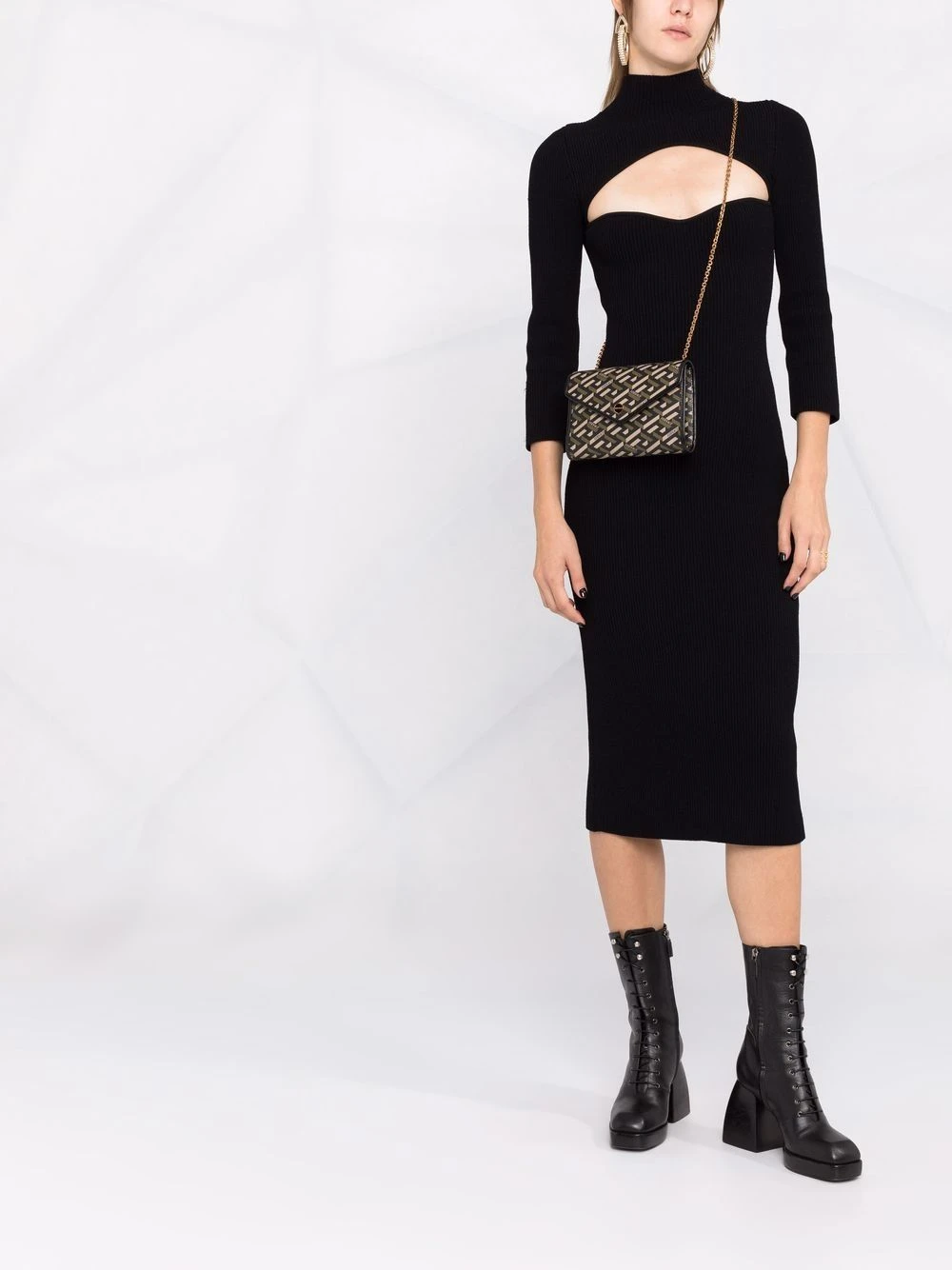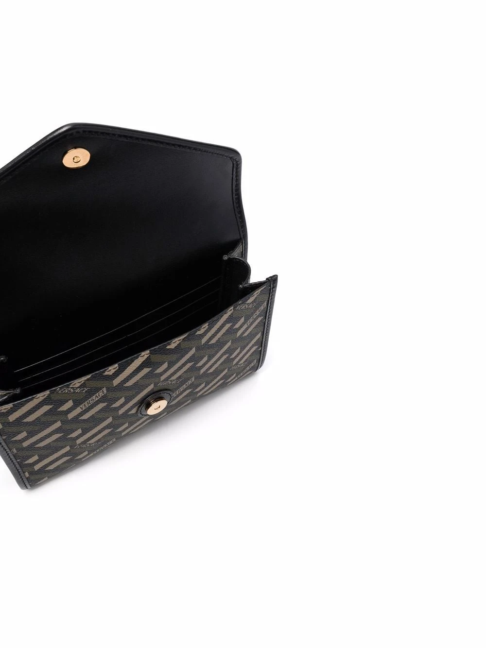 Imprimé La Greca signature, bride porté épaule en chaîne détachable, finitions en métal doré, coutures contrastantes, style enveloppe.