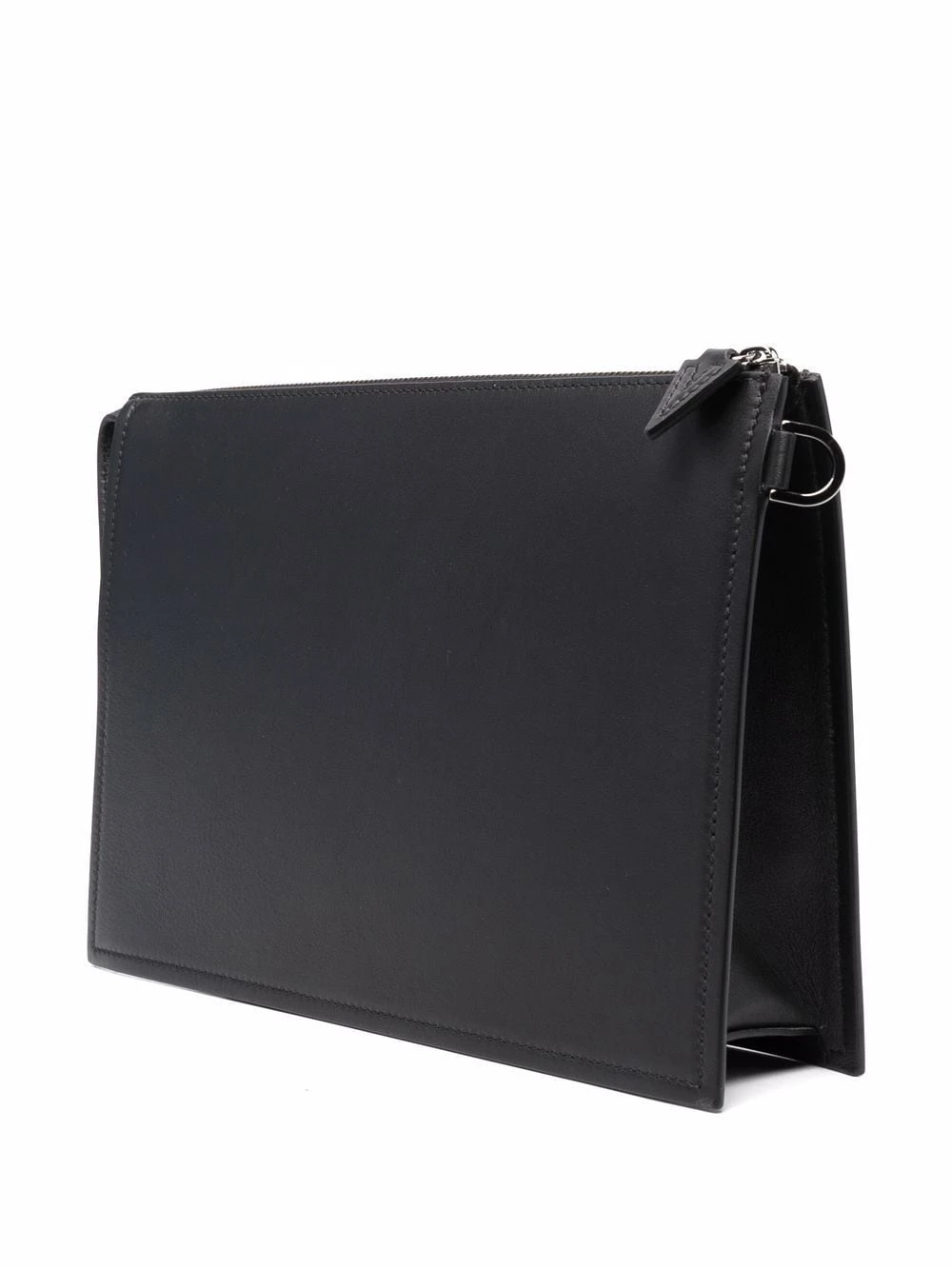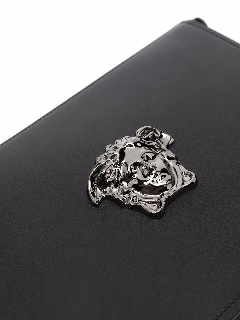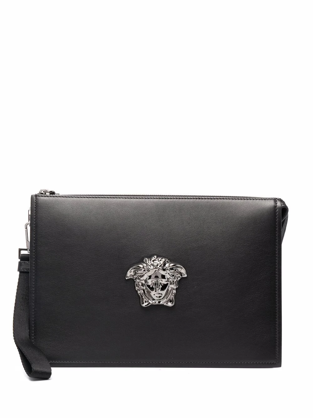 Motif Medusa, fermeture zippée sur le dessus, poches intérieures zippées, bride porté poignet. Couleur : noir. Matière : cuir.