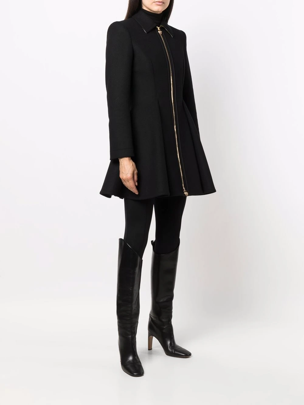 Col classique, fermeture zippée devant, détail Medusa, finitions en métal doré, manches longues, ourlet péplum. Couleur : noir. Matière : laine vierge.