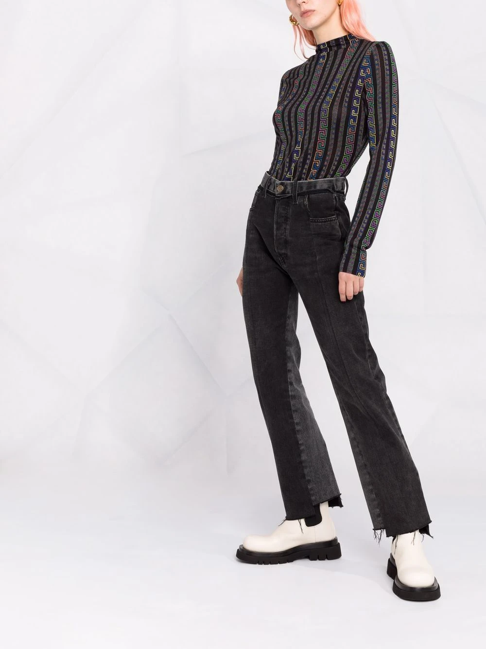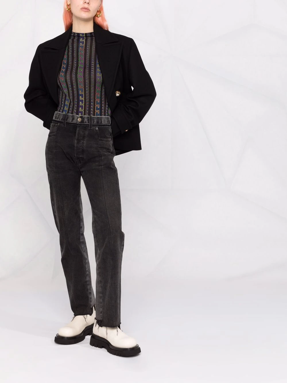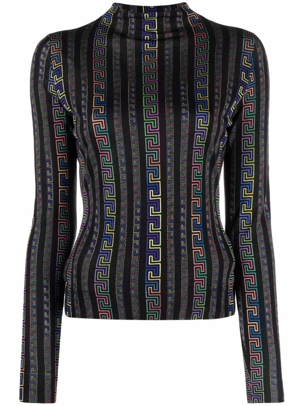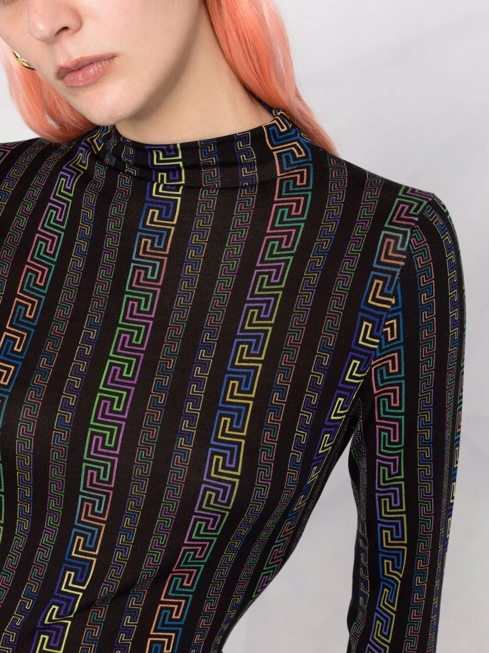Col montant, détail Greca signature, manches longues. Matière : soie.
