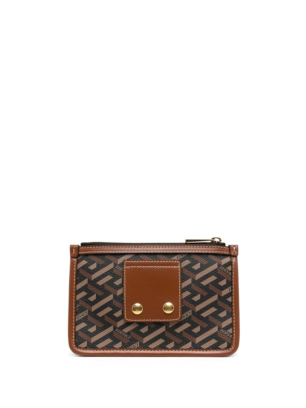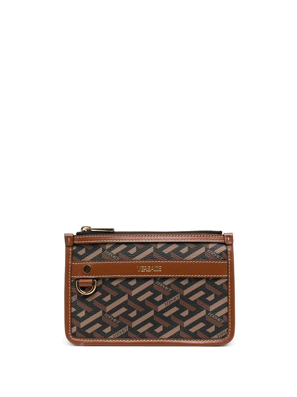 Imprimé La Greca signature, logo imprimé sur le devant, fermeture zippée sur le dessus, patch logo intérieur, finitions en métal doré. Matière : cuir.