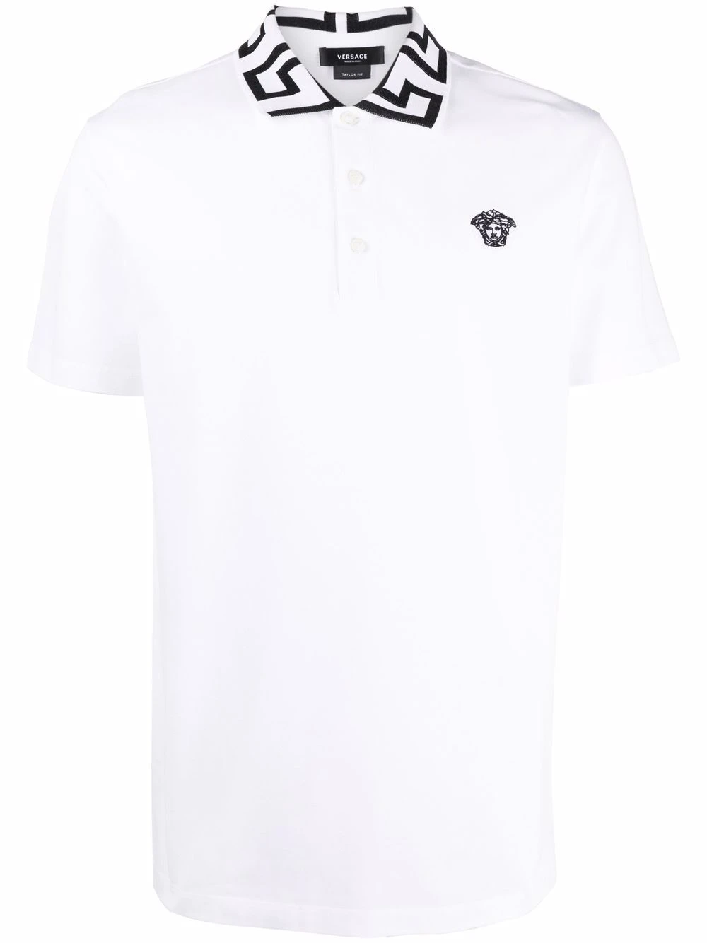 Motif Medusa, détail Greca signature, col italien, patte de boutonnage sur le devant, manches courtes. Couleur : blanc. Matière : coton.