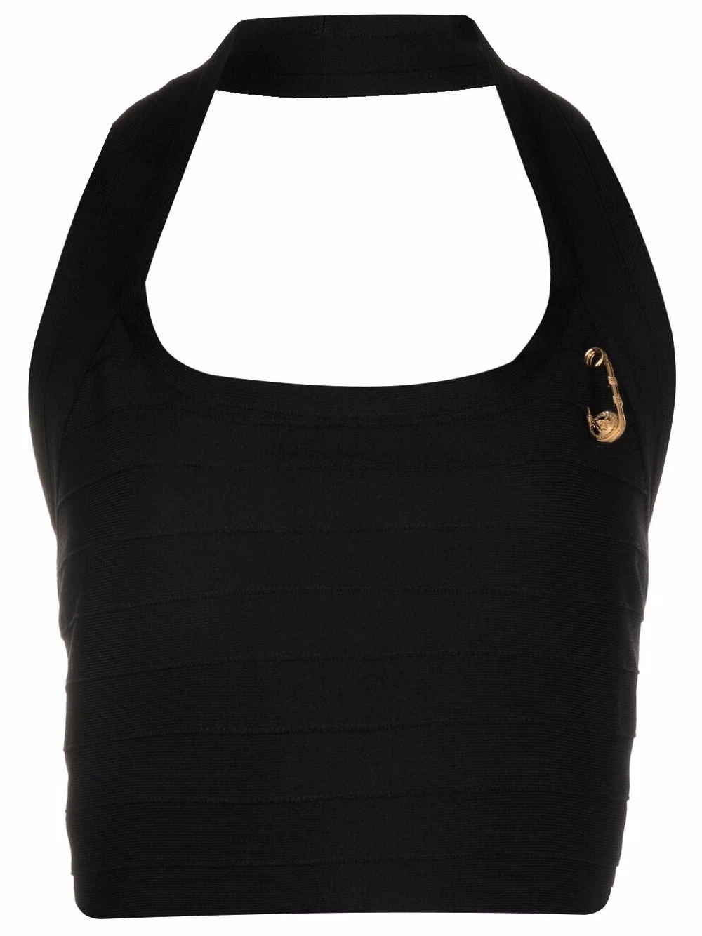 Détail d’épingle à nourrice, design sans manches, dos-nu, fermeture zippée à l’arrière, coupe courte. Couleur : noir.