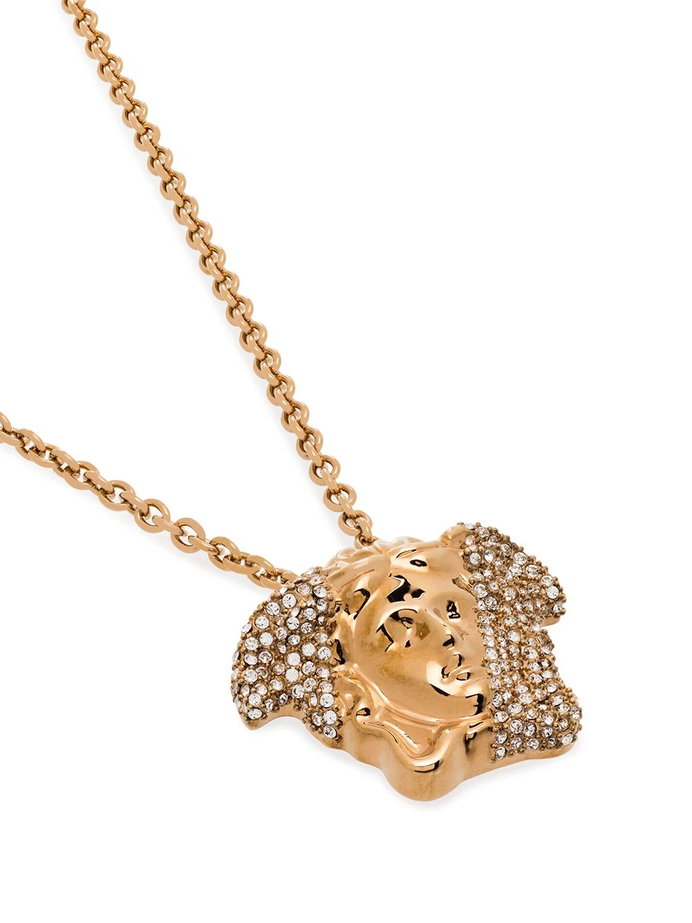Ornement en cristal, motif Medusa, chaîne fine, fermoir mousqueton. Couleur : jaune. Matière : laiton.