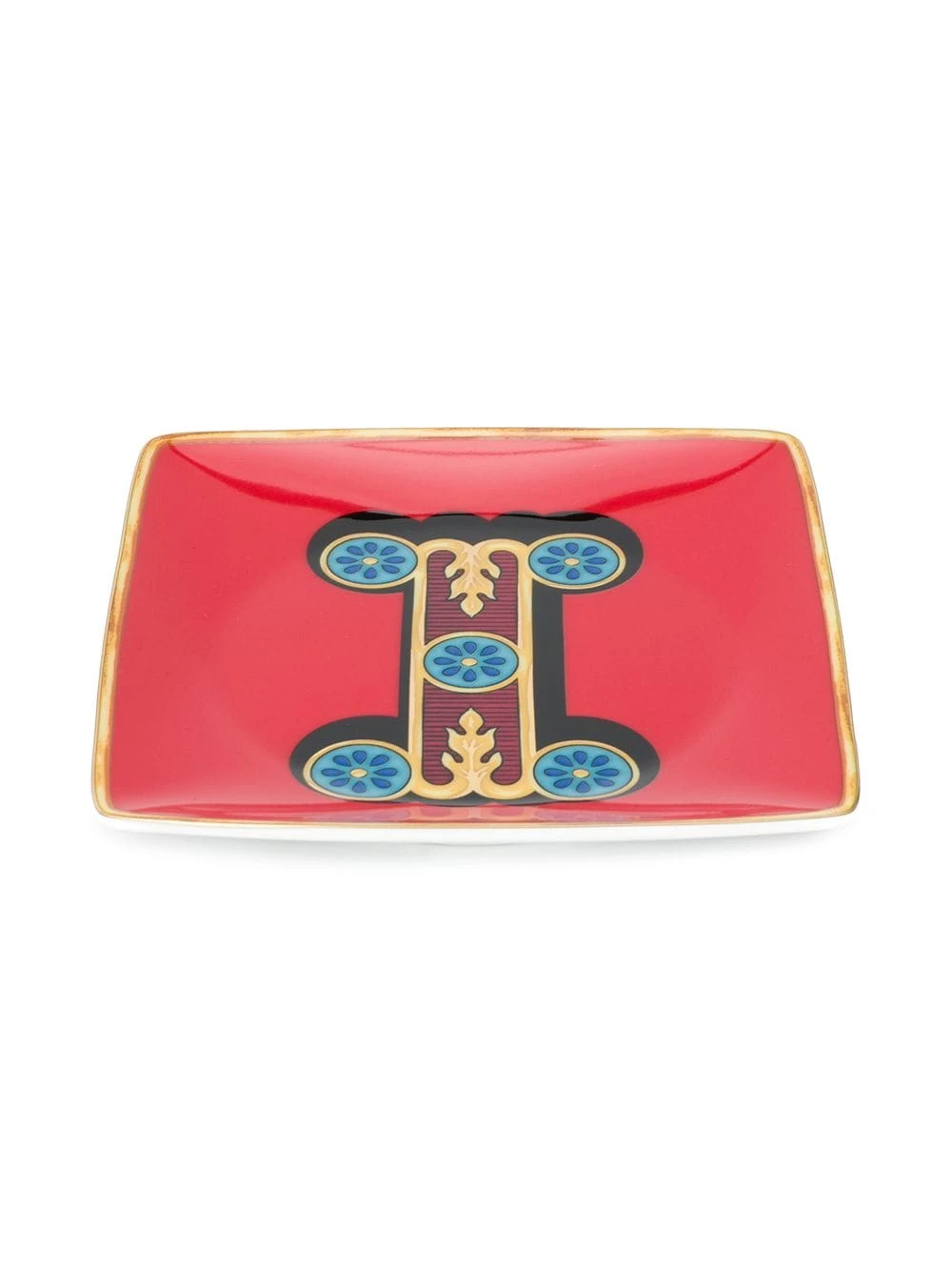 Assiestte Holiday Alphabet ‘I’ Versace Home avec forme carrée, imprimé baroque et dessus concave. Couleur : rouge.