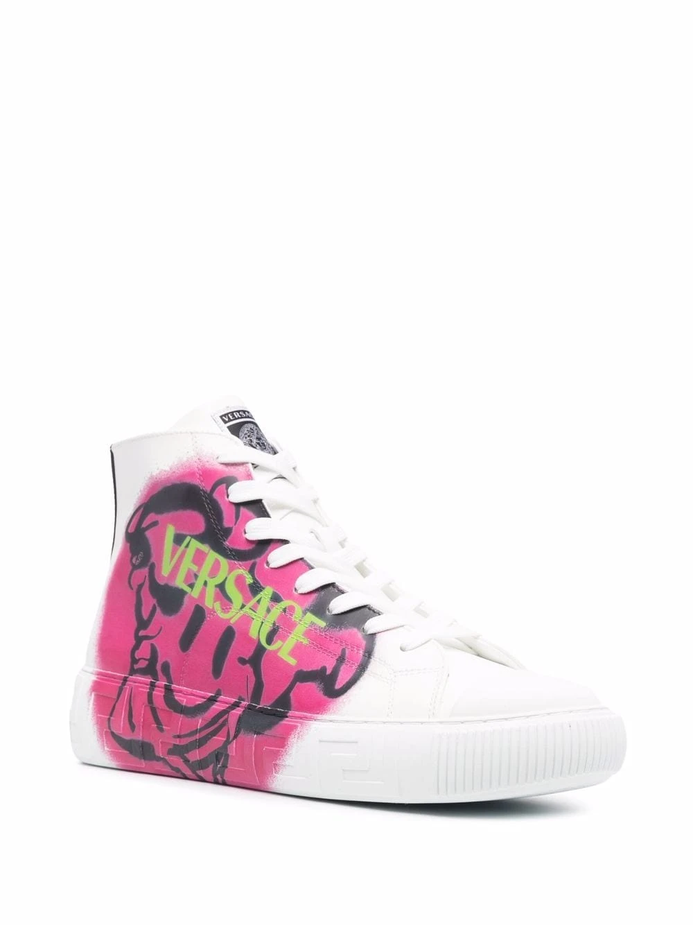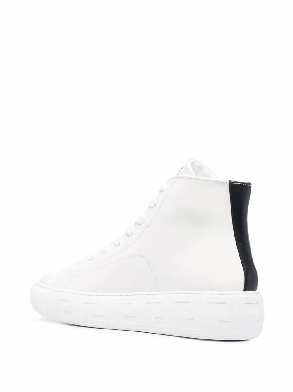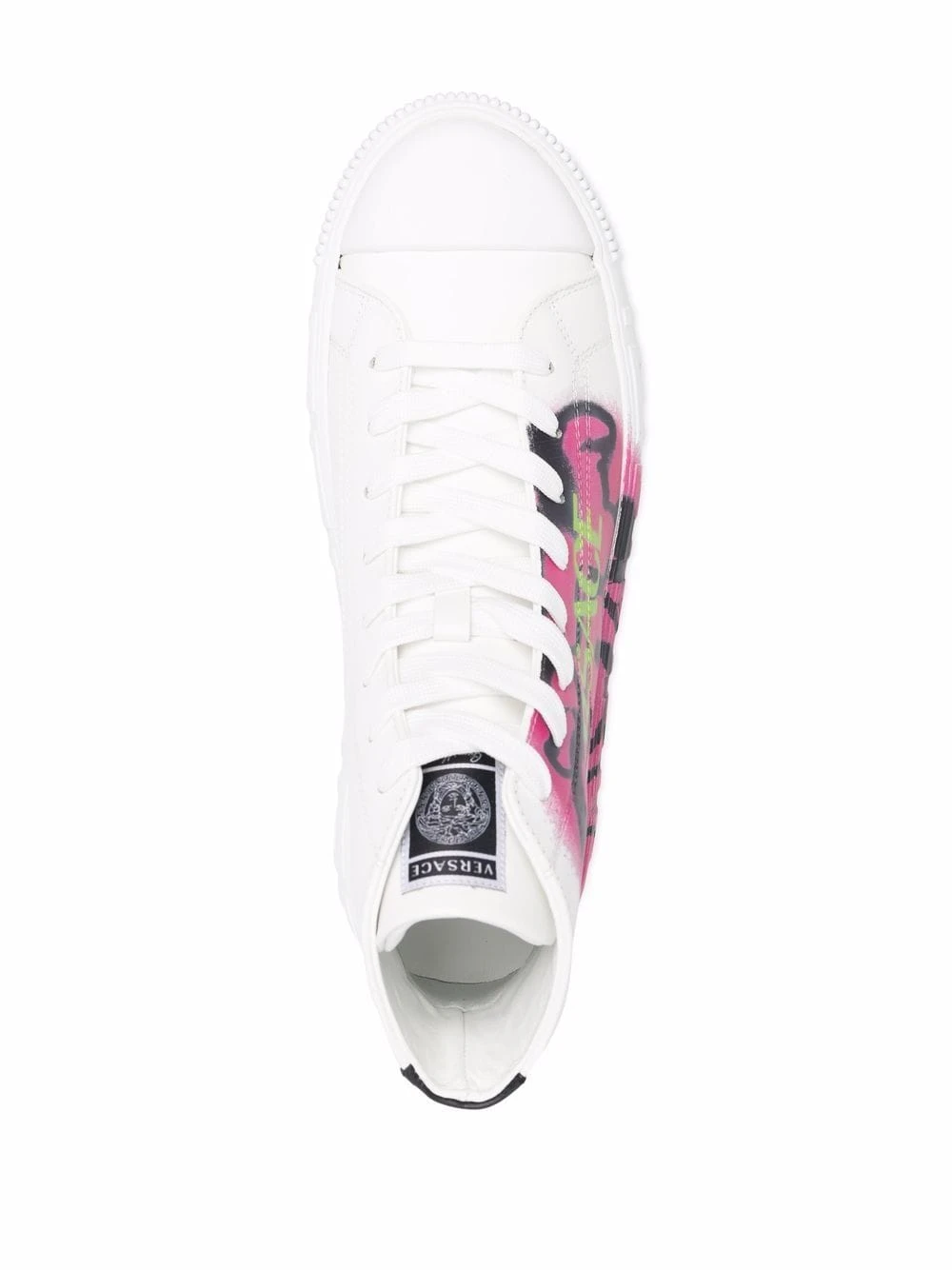 Motif Medusa Smile signature, languette à patch logo, fermeture à lacer sur le devant, bout rond, semelle plate en caoutchouc. Couleur : blanc. Matière : cuir.