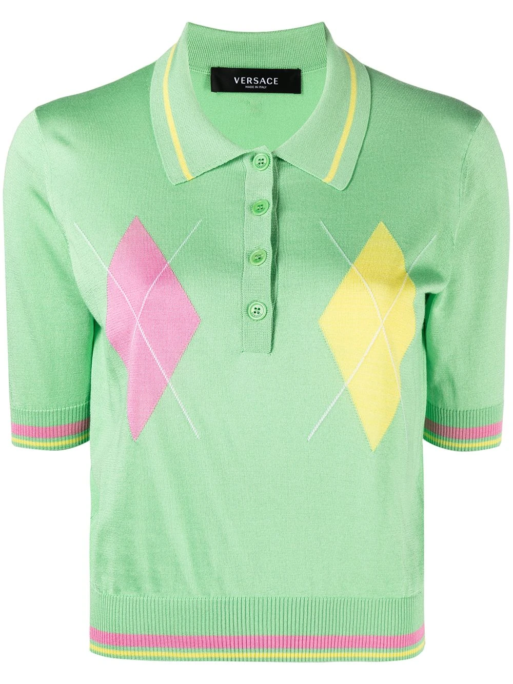Motif losange, maille fine, col polo, manches courtes. Matière : soie.
