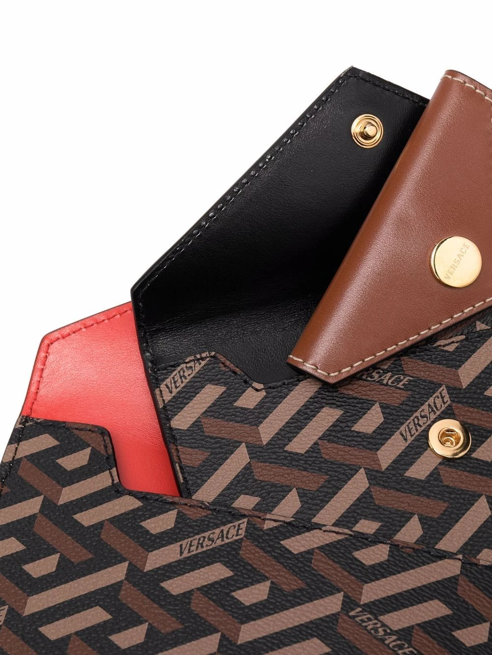Imprimé La Greca signature, finitions en métal doré, style enveloppe, rabat sur le dessus à boutons pression. Matière : cuir.