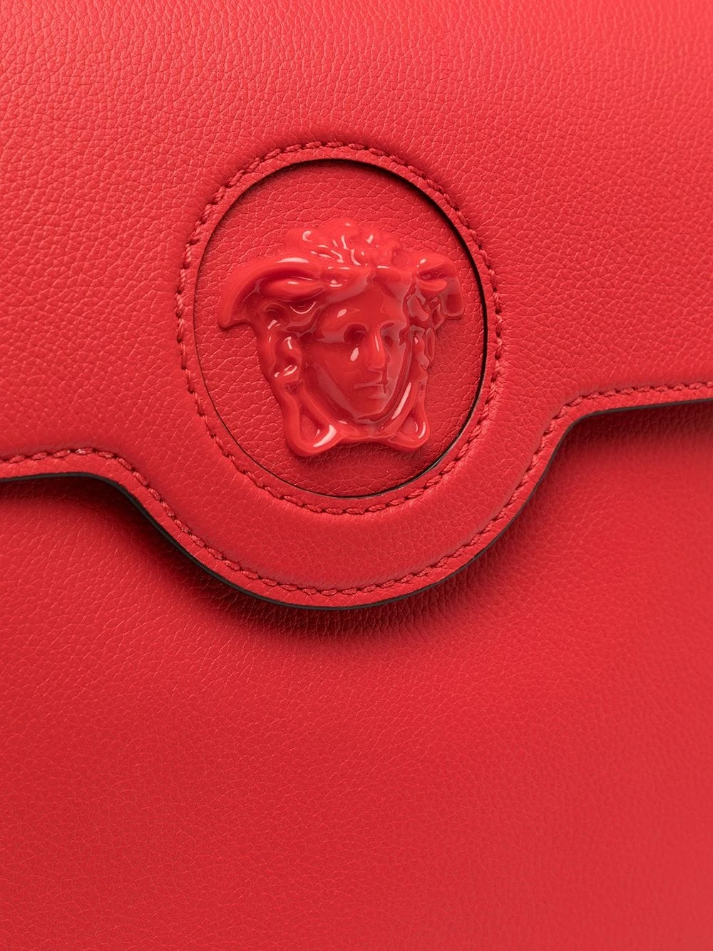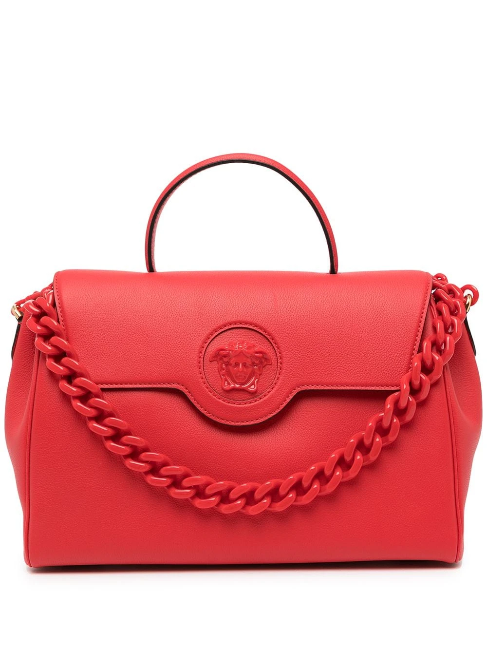 Motif Medusa, bride porté épaule en chaîne, bride porté épaule détachable et ajustable, anse arrondie, rabat sur le dessus à fermeture magnétique, logo doré, poches intérieures zippées. Couleur : rouge. Matière : cuir.