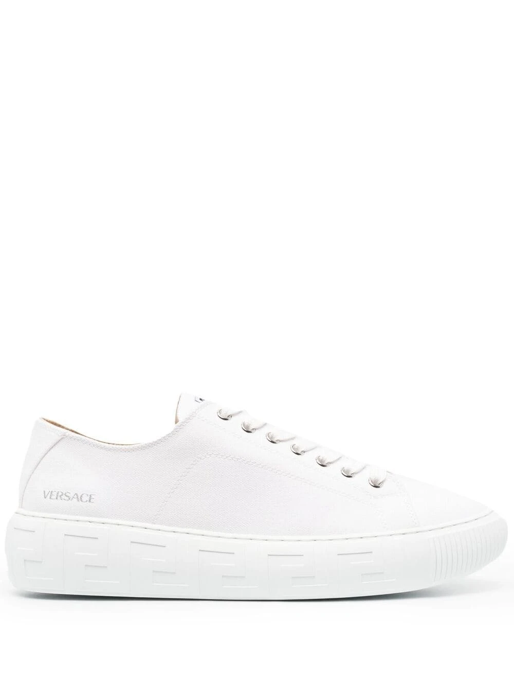 Détail Greca signature, logo imprimé sur le côté, bout rond, fermeture à lacer sur le devant, semelle intérieure à logo, semelle plate en caoutchouc. Couleur : blanc. Matière : coton.