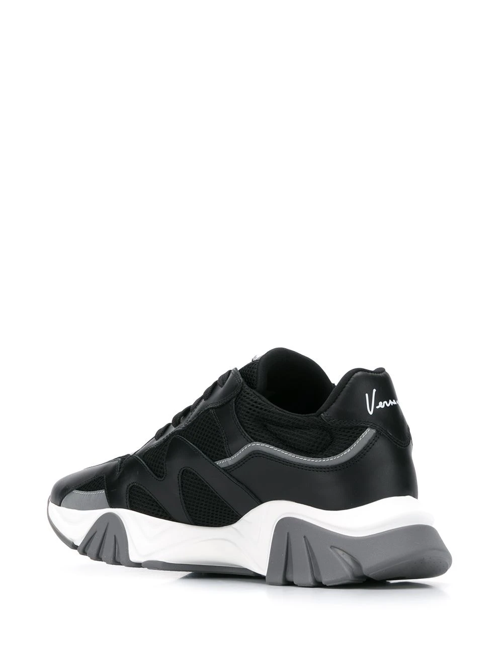 Baskets Squalo en cuirs Versace avec bout rond, fermeture à lacer sur le devant, patch logo sur la languette, empiècements en résille et monogramme sur le talon.