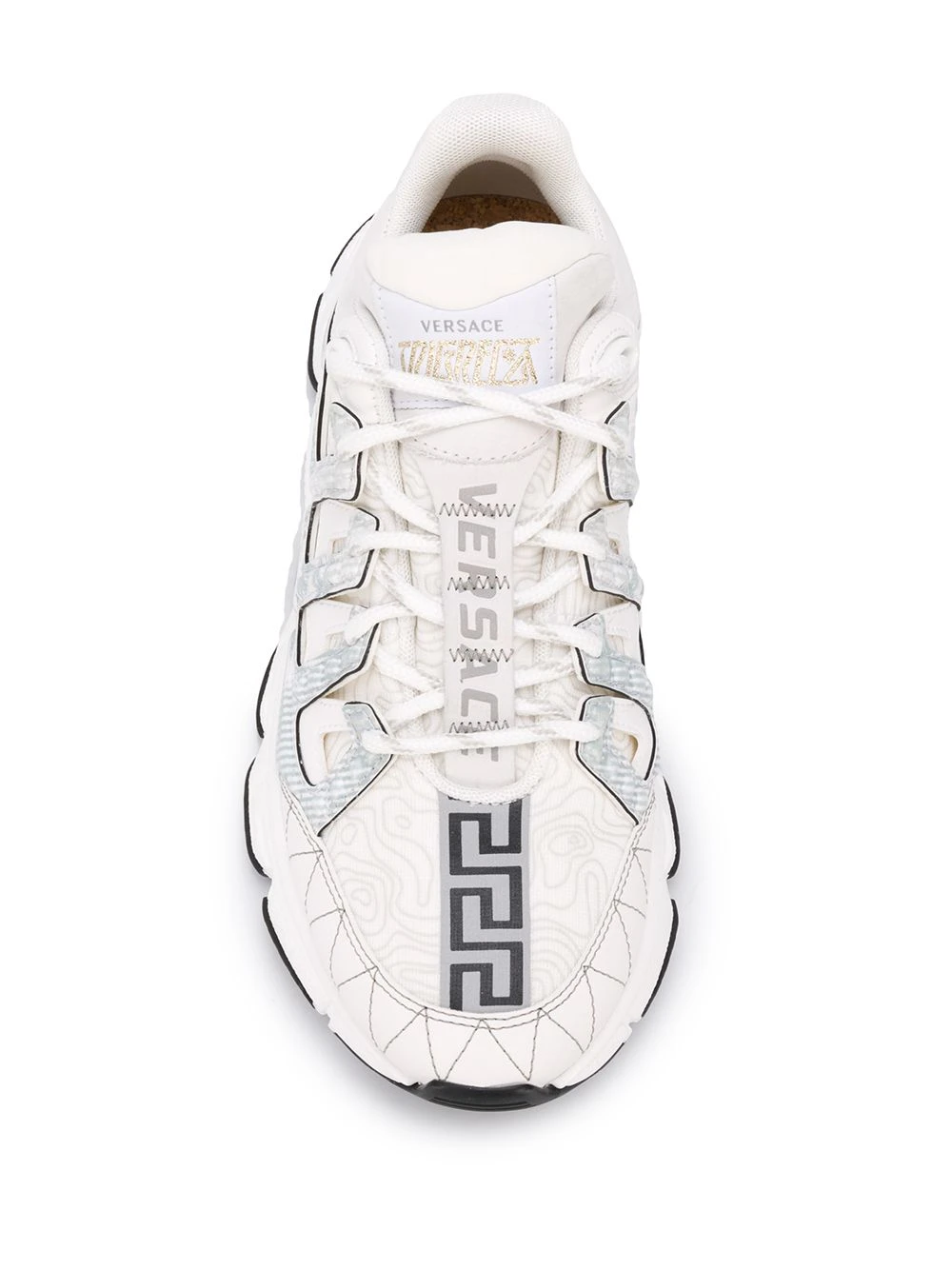 Design à empiècements, languette à logo imprimé, bout rond, fermeture à lacer sur le devant, contrefort à logo. Couleur : blanc. Matière : cuir.