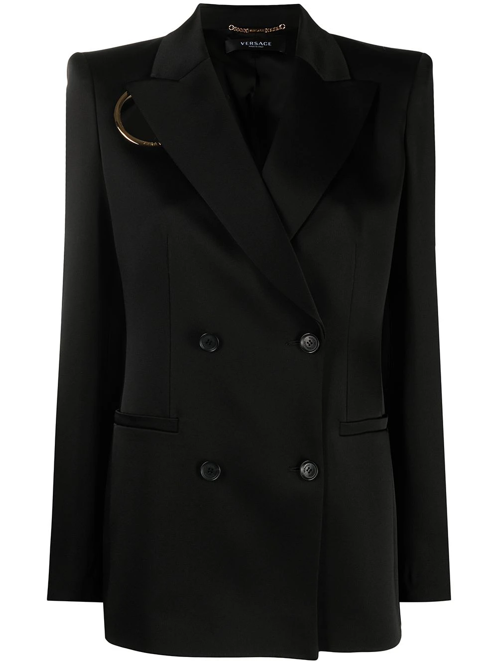 Revers pointus, boutonnière croisée, deux poches passepoilées avant, manches longues, poignets boutonnés, ourlet droit, épaulettes. Couleur : noir. Matière : satin.