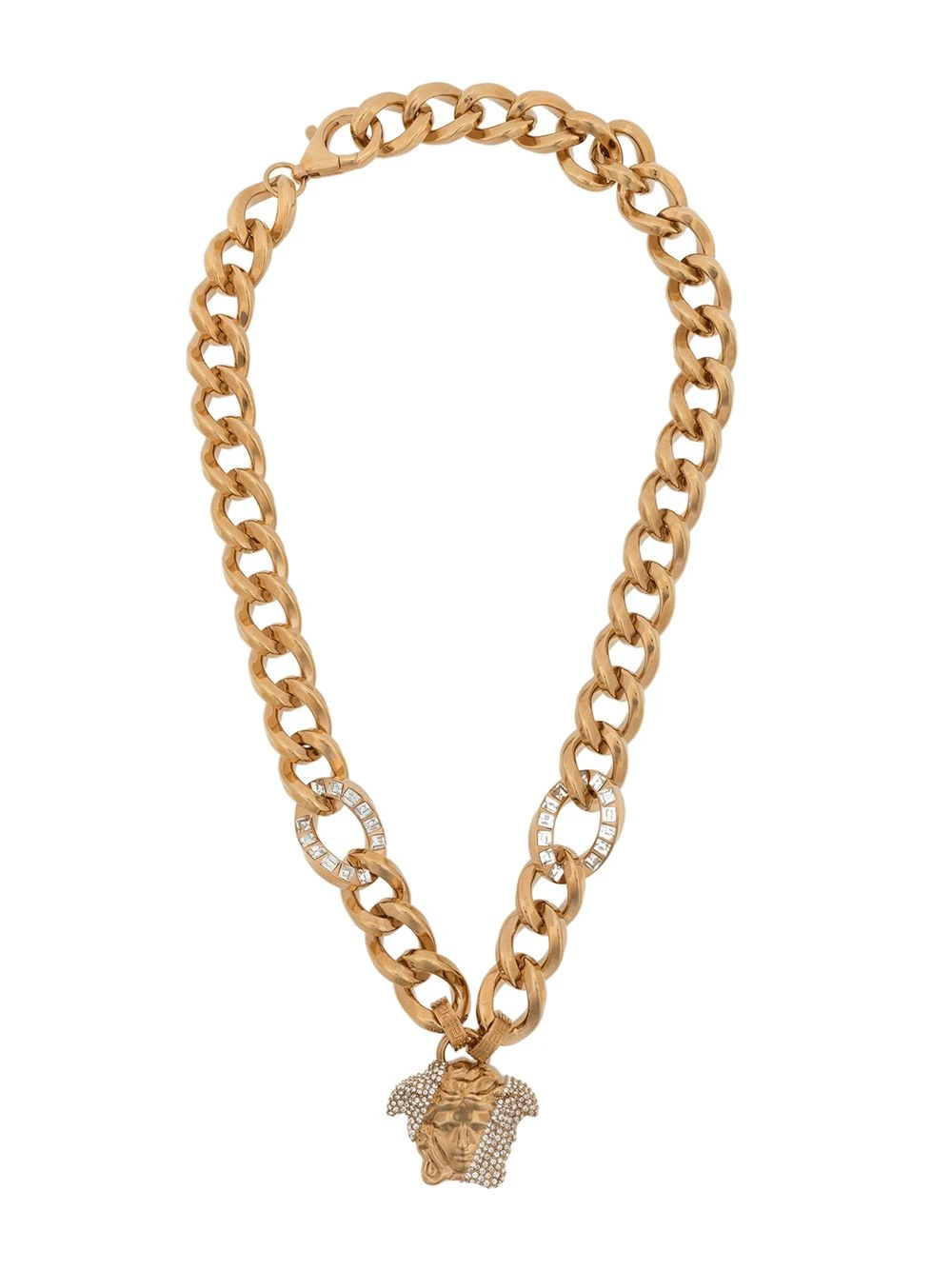 Fermoir mousqueton, ornement en cristal, motif Medusa, détail Greca signature. Couleur : doré. Matière : métal.