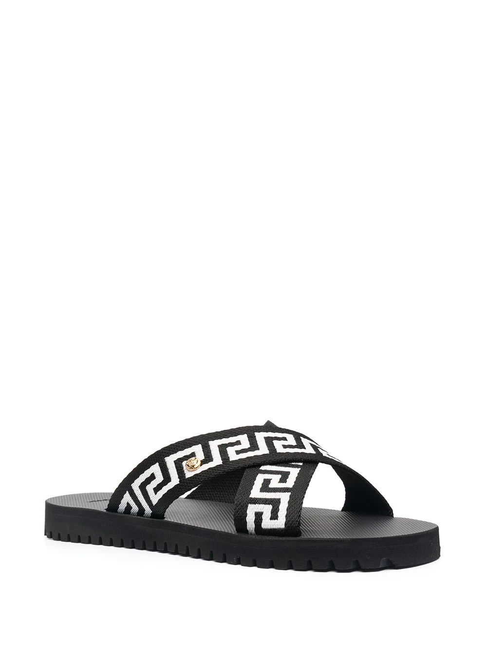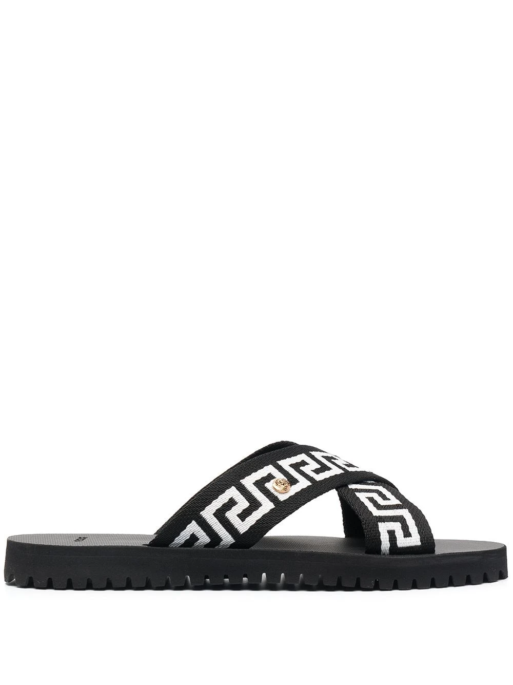 Détail Greca signature, bout ouvert, détail de brides croisées, design à enfiler, semelle plate en caoutchouc. Couleur : Noir. Matière : caoutchouc.