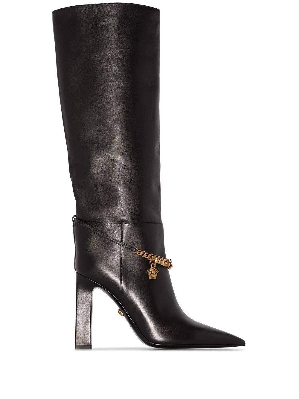 Détails de chaînes, talon haut épais, bout pointu, design à enfiler. Couleur : noir. Matière : cuir.