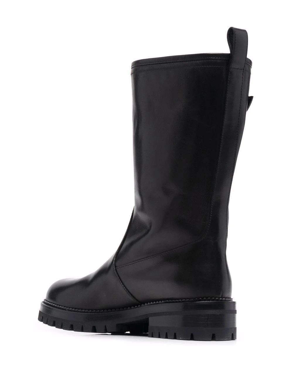 Détail d’épingle Medusa signature, bout rond, à enfiler, languette d’enfilage au talon, longueur midi, semelle crantée en caoutchouc. Couleur : noir. Matière : cuir.
