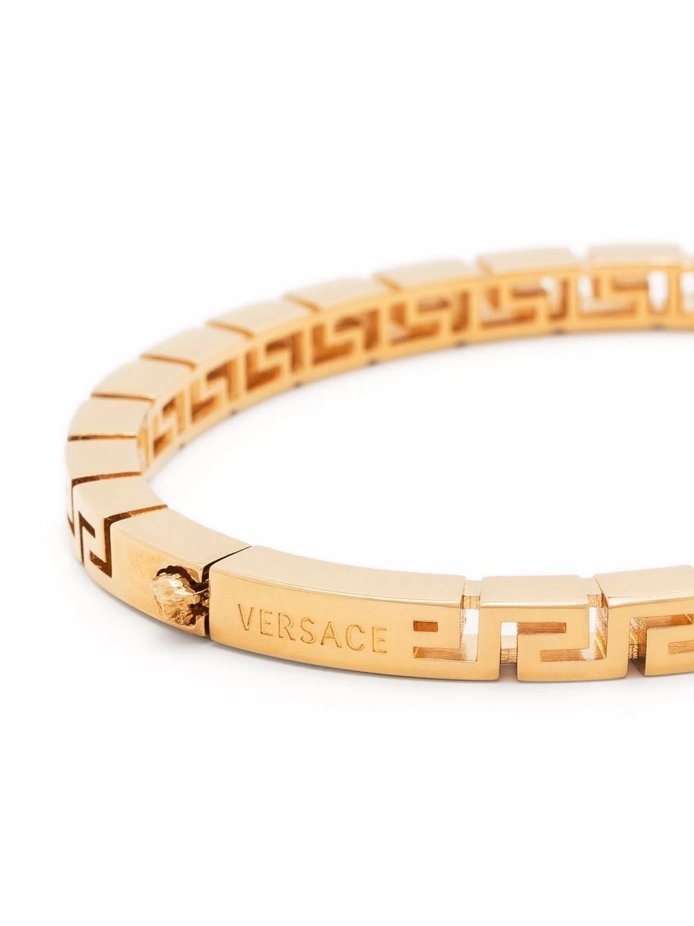 Détail Greca signature, finitions en métal doré, logo gravé, fermeture à loquet.