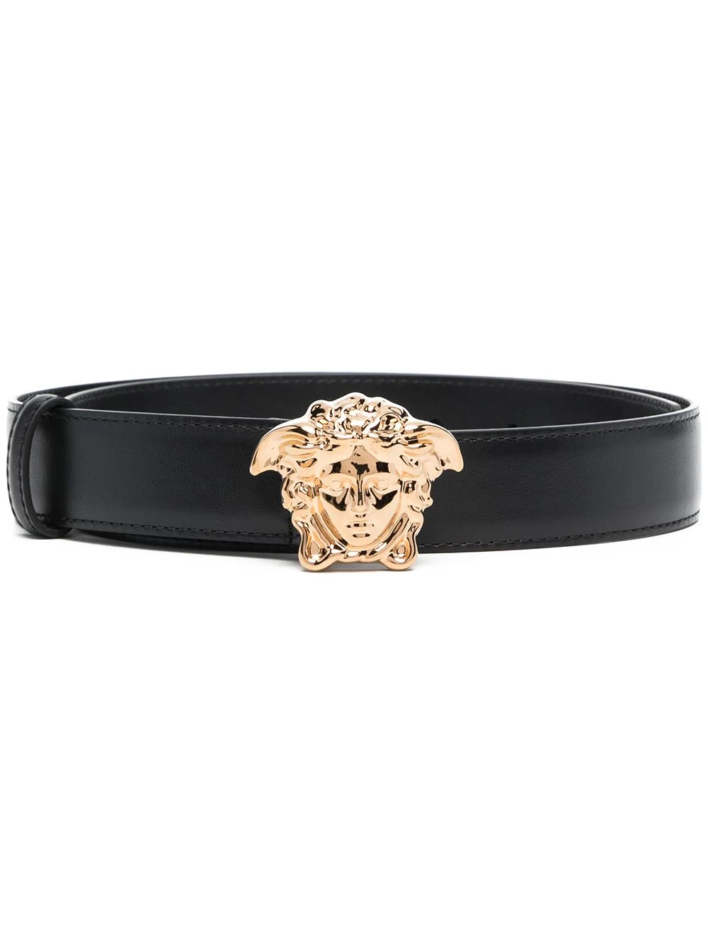 Détail Medusa, finitions en métal doré, trous pré-percés, taille ajustable. Couleur : Noir. Matière : cuir.