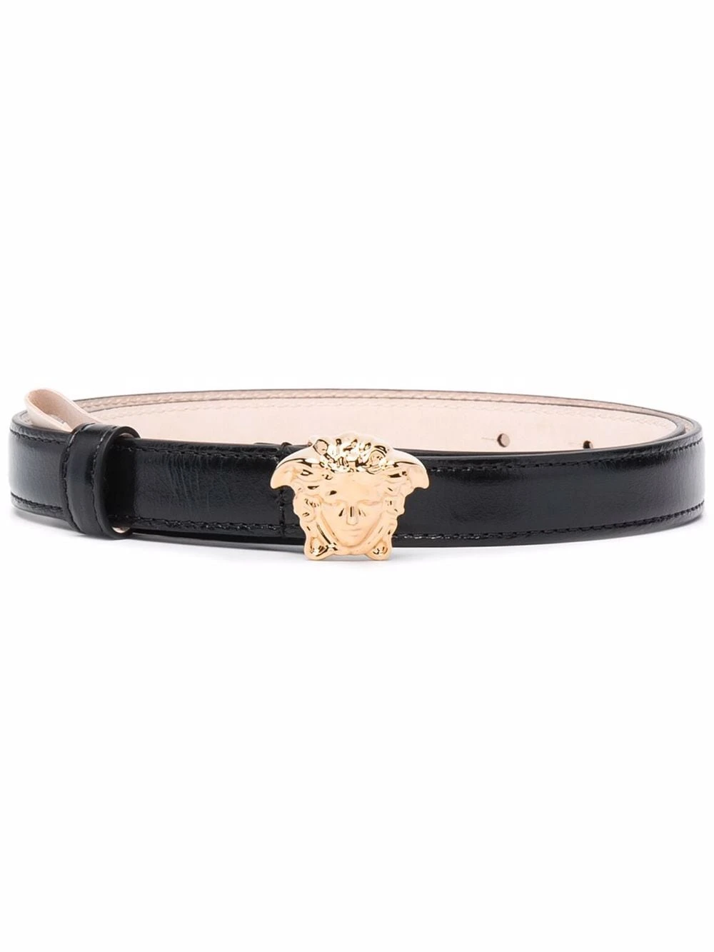 Détail Medusa, finitions en métal doré, fermeture à boucle, taille ajustable. Couleur : noir. Matière : cuir.